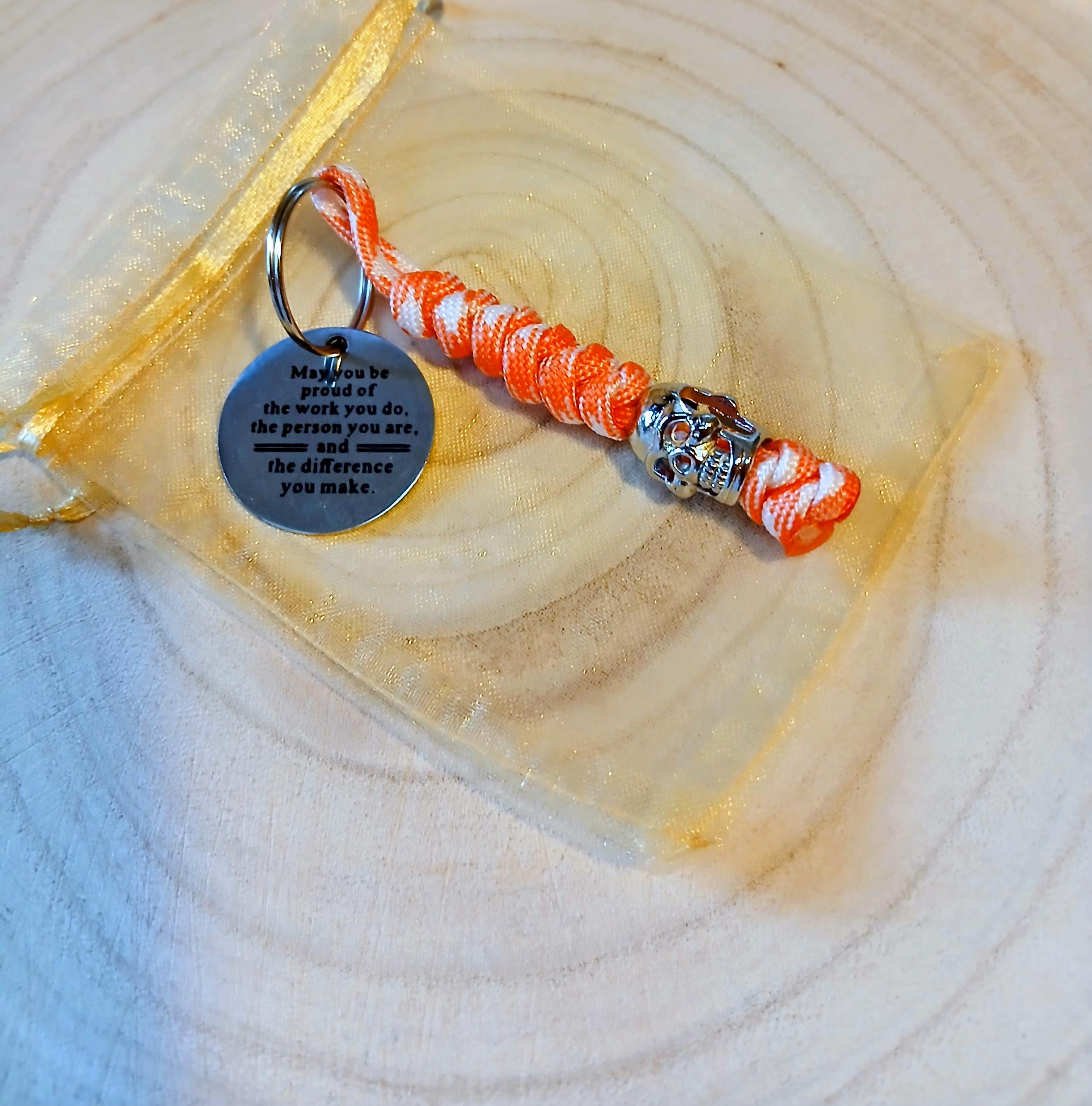 Handmade with striking orange and white paracord, this keyring brings together bold design and meaningful detail. The polished skull bead adds an edgy, gothic touch, while the attached metal fob carries an inspiring message to keep close every day: