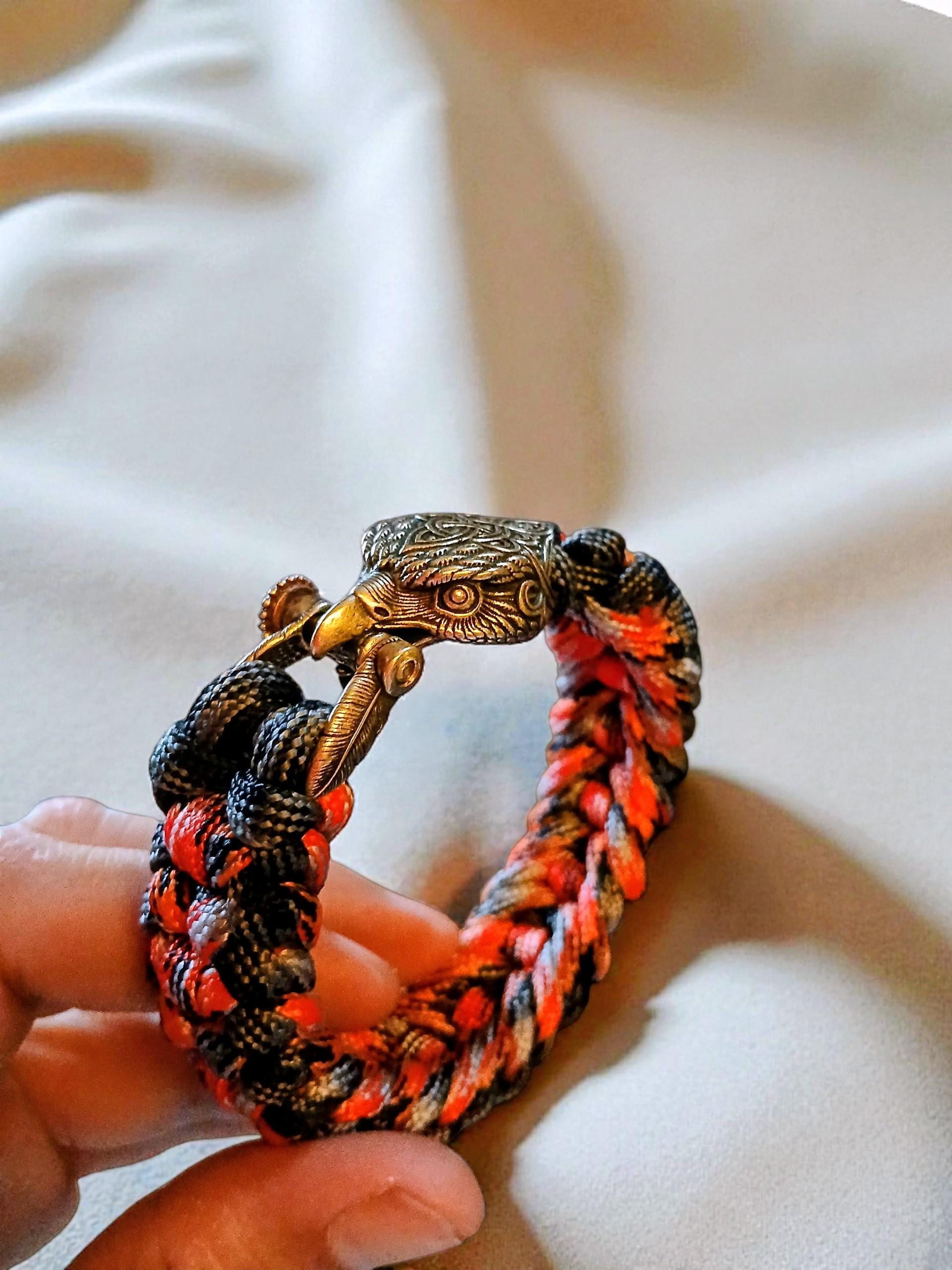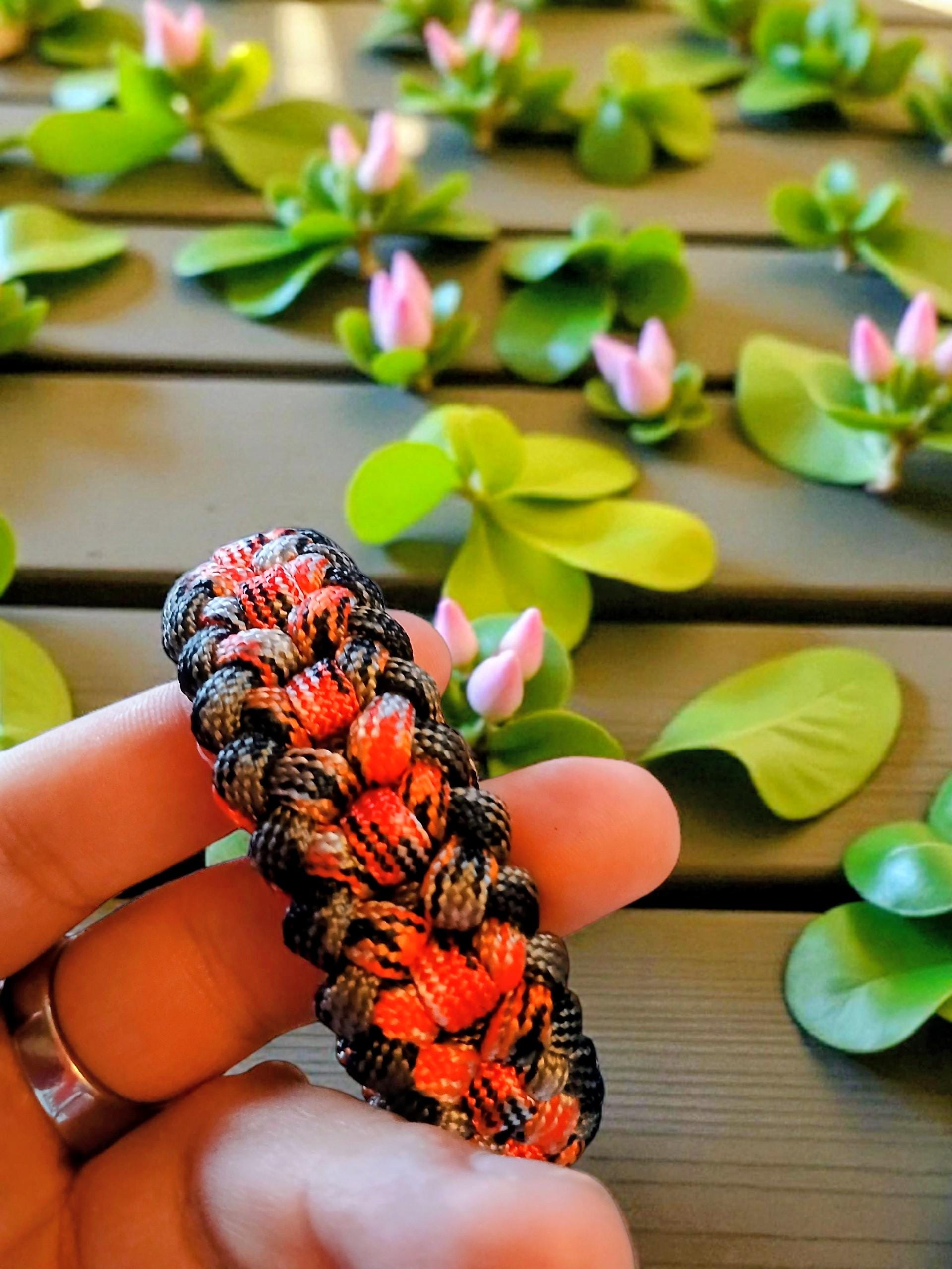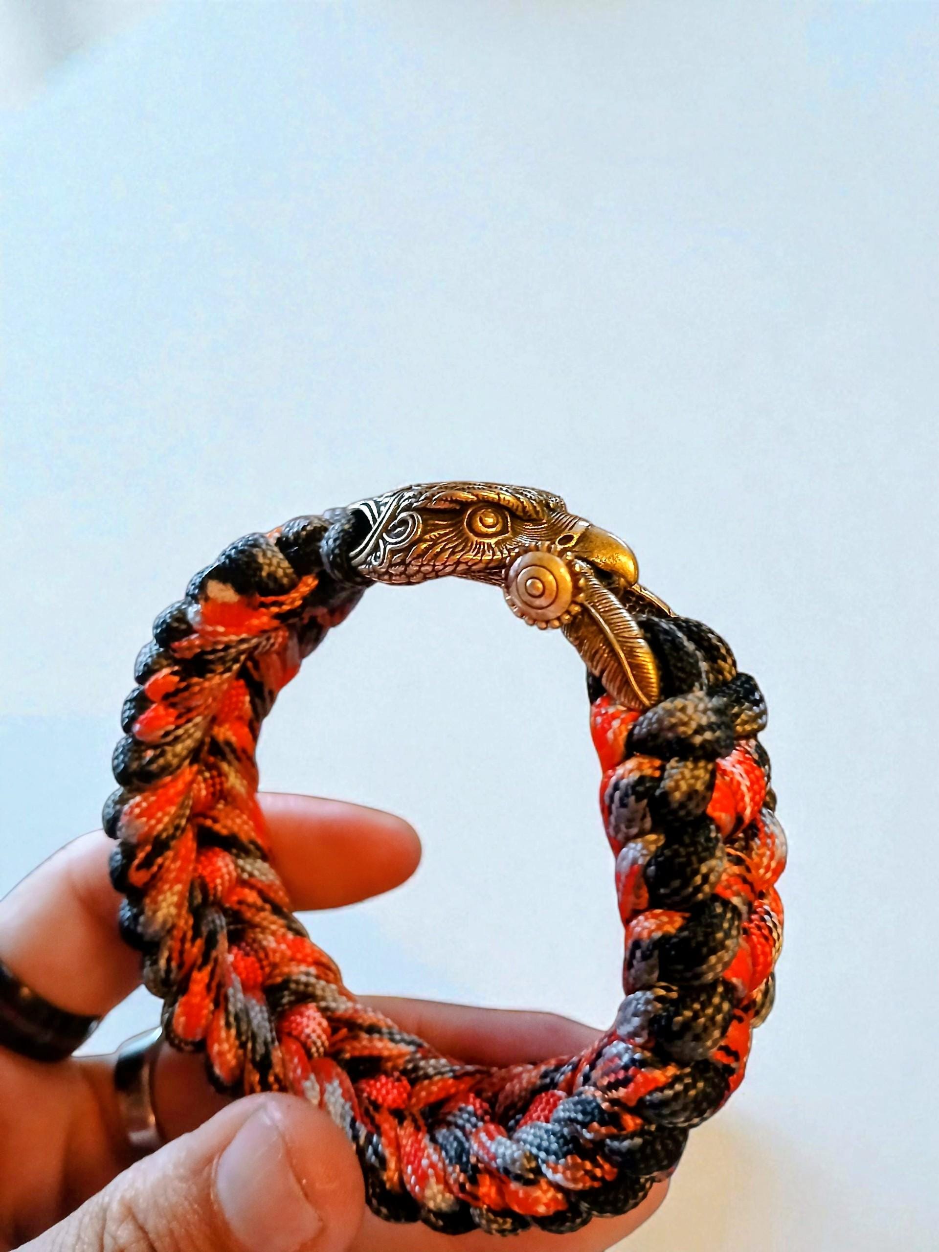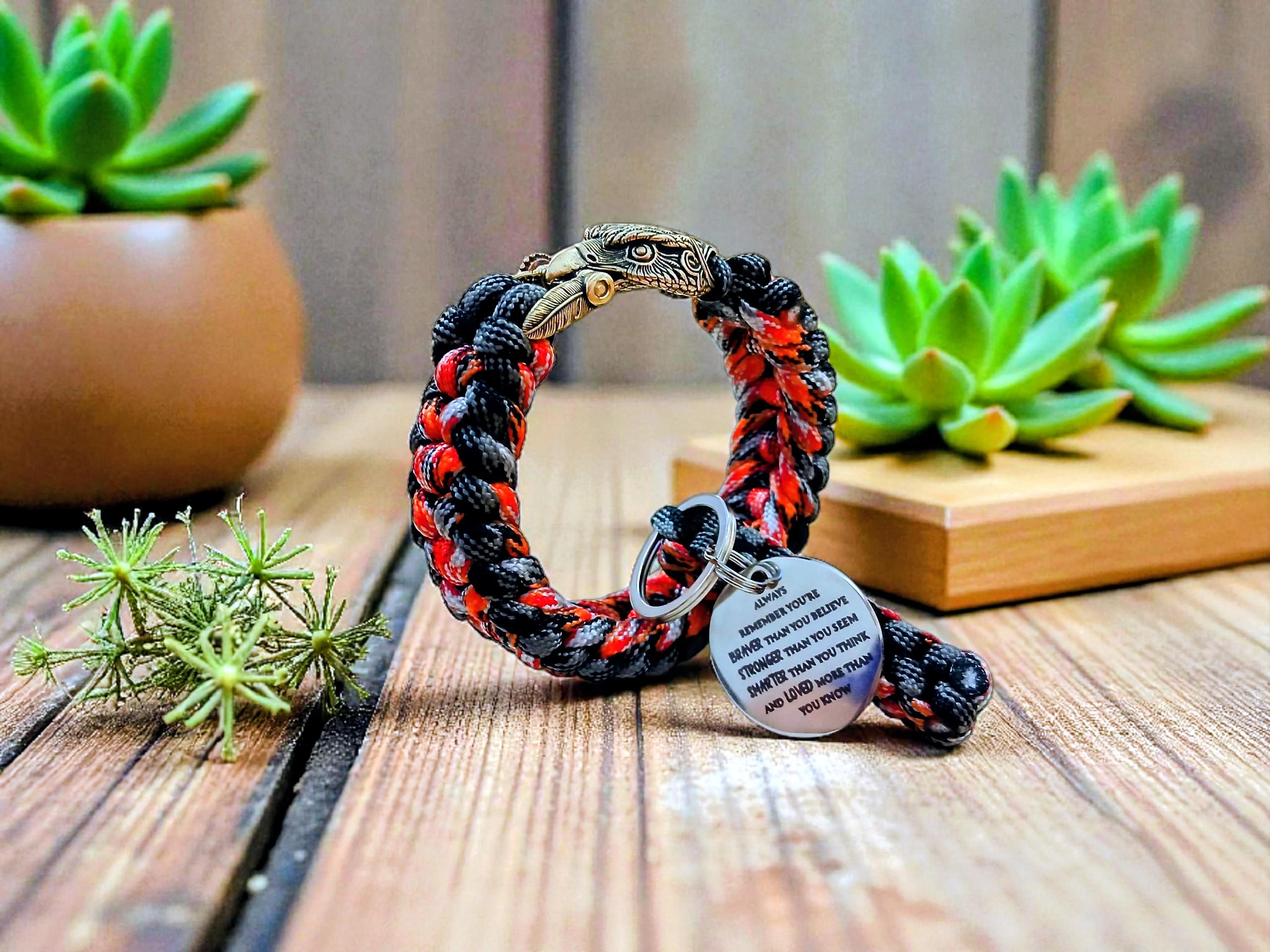 Handmade with striking black, grey, and ember-orange & red paracord, The Firewing Set combines bold style with meaningful detail.