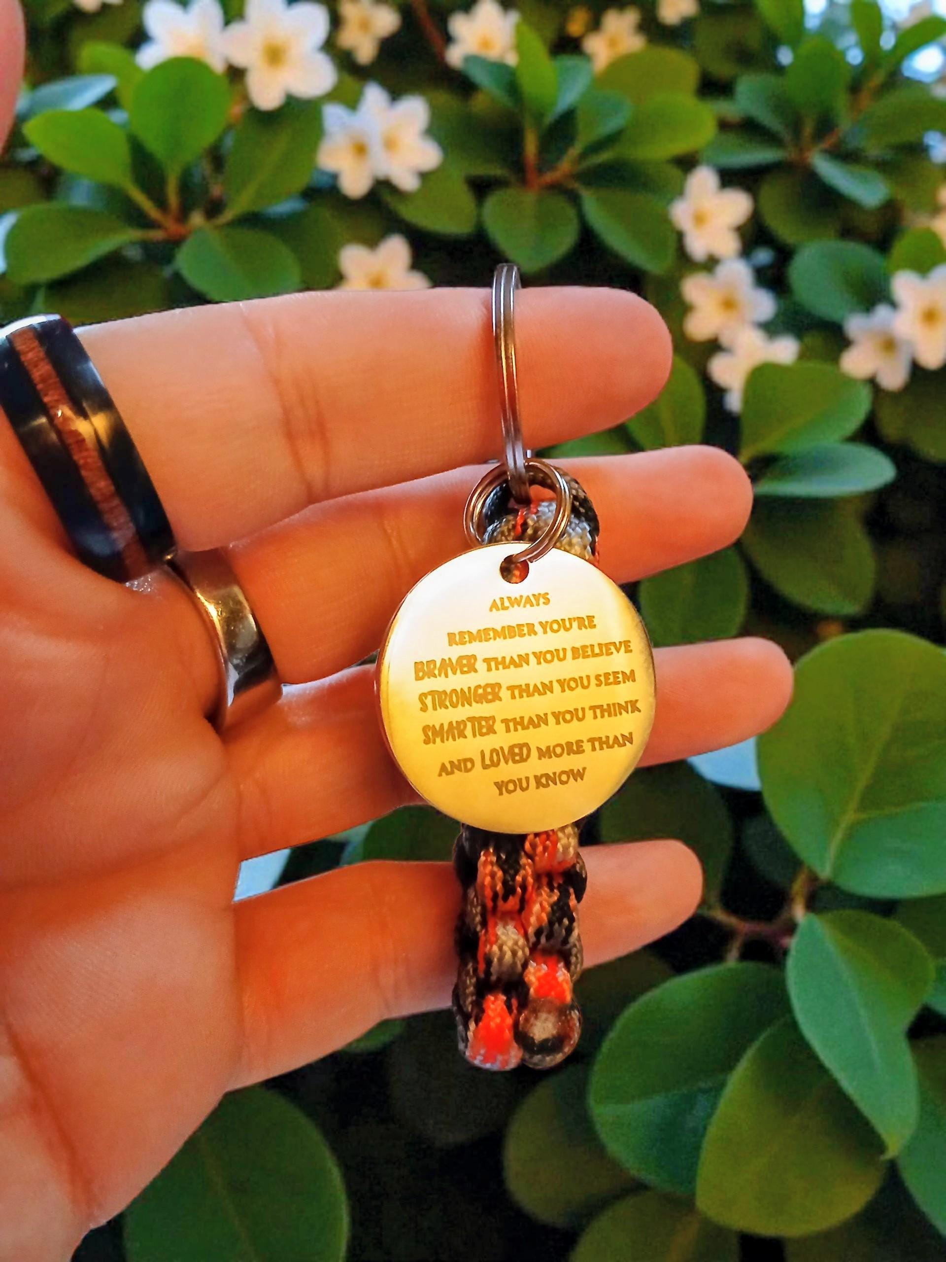 Material: 550 paracord + bronze eagle clasp + engraved keyring fob