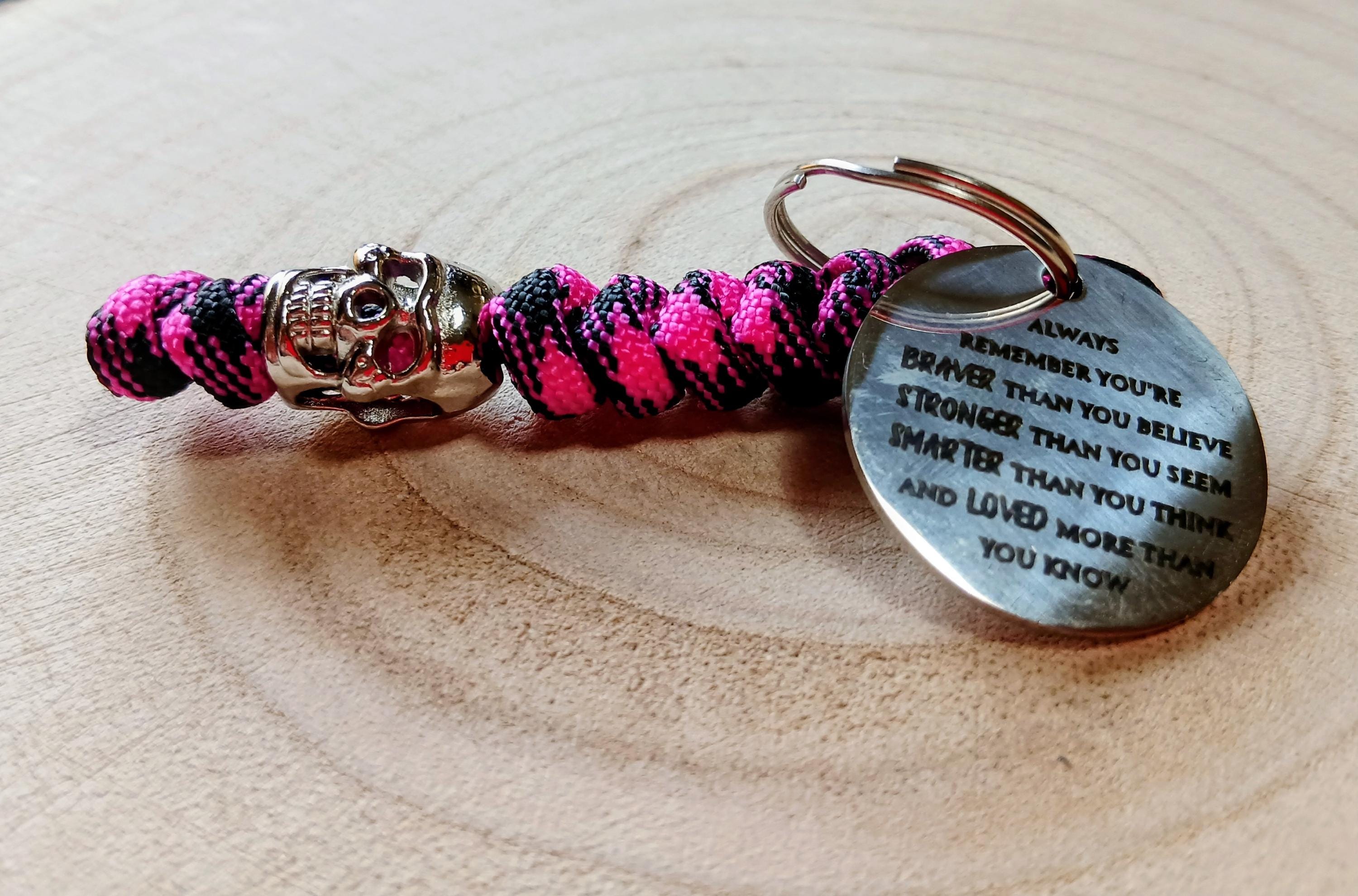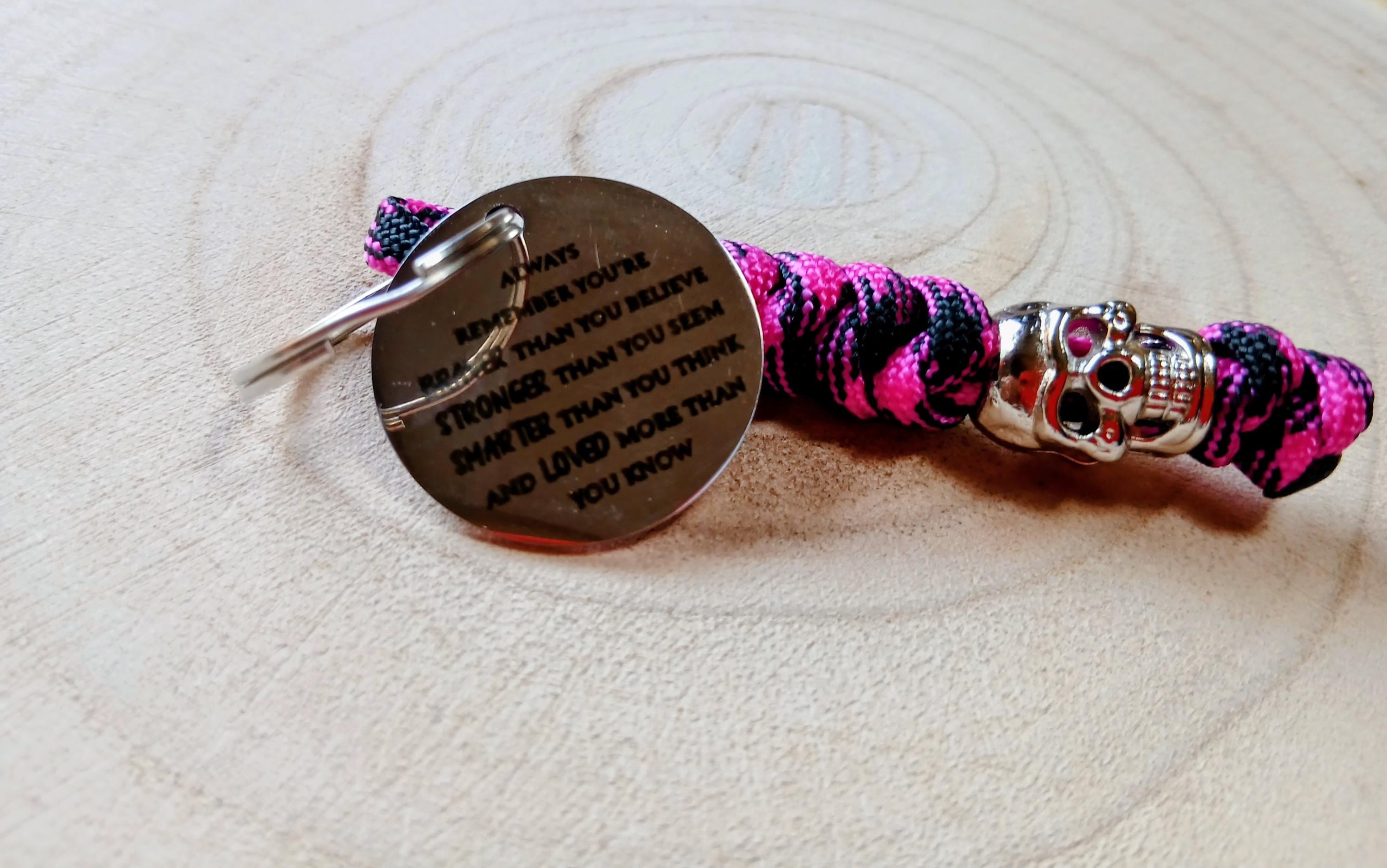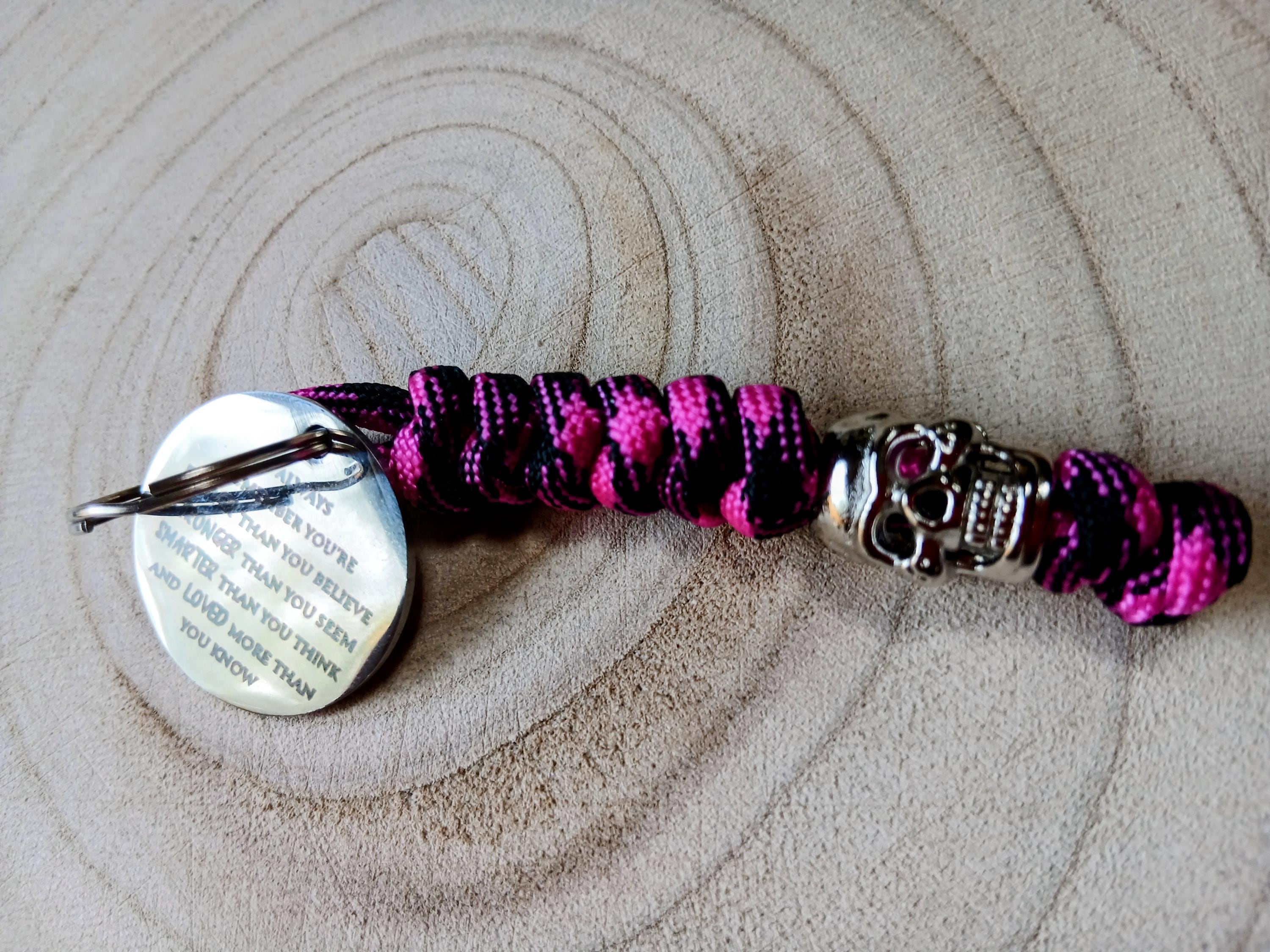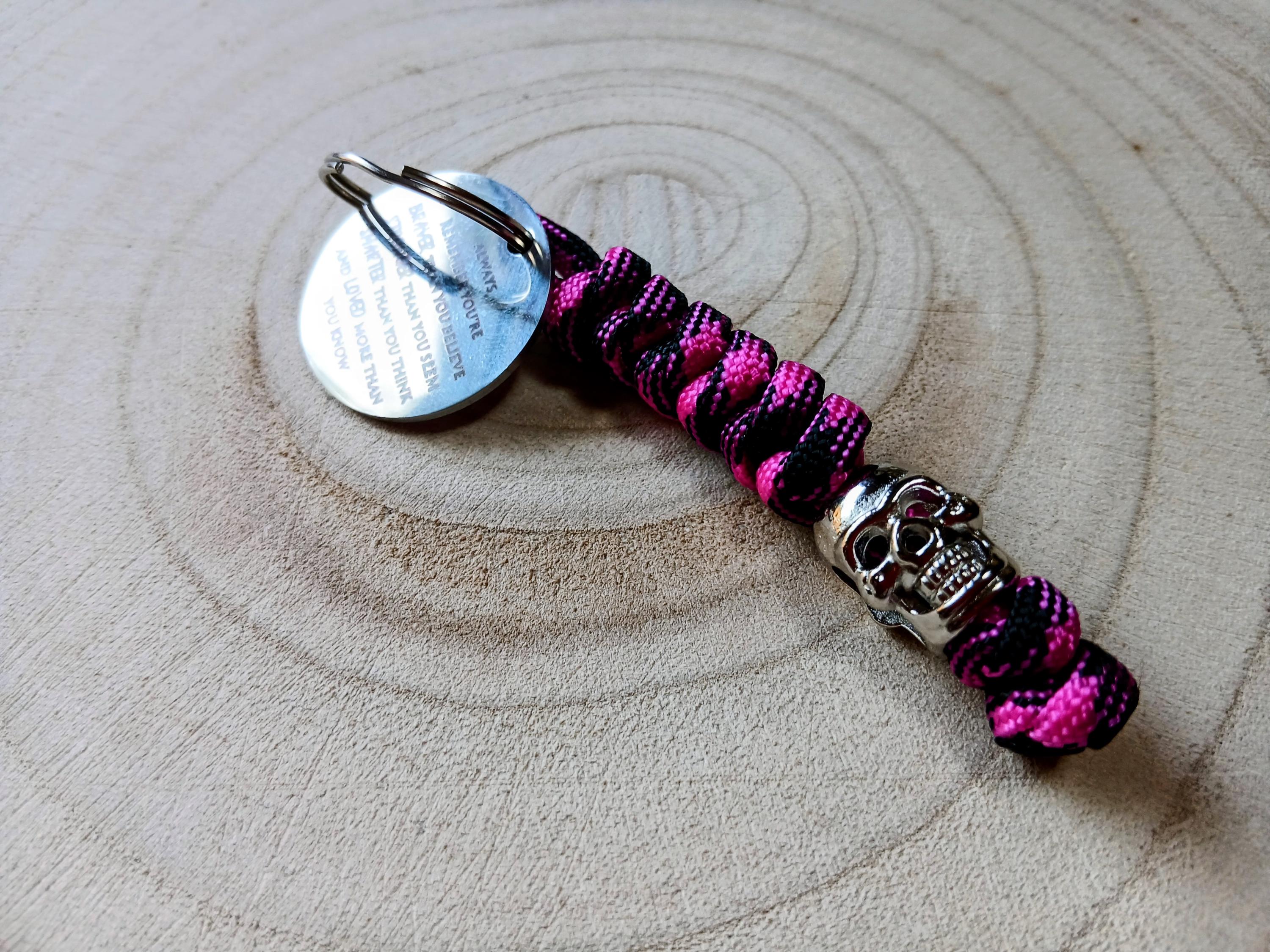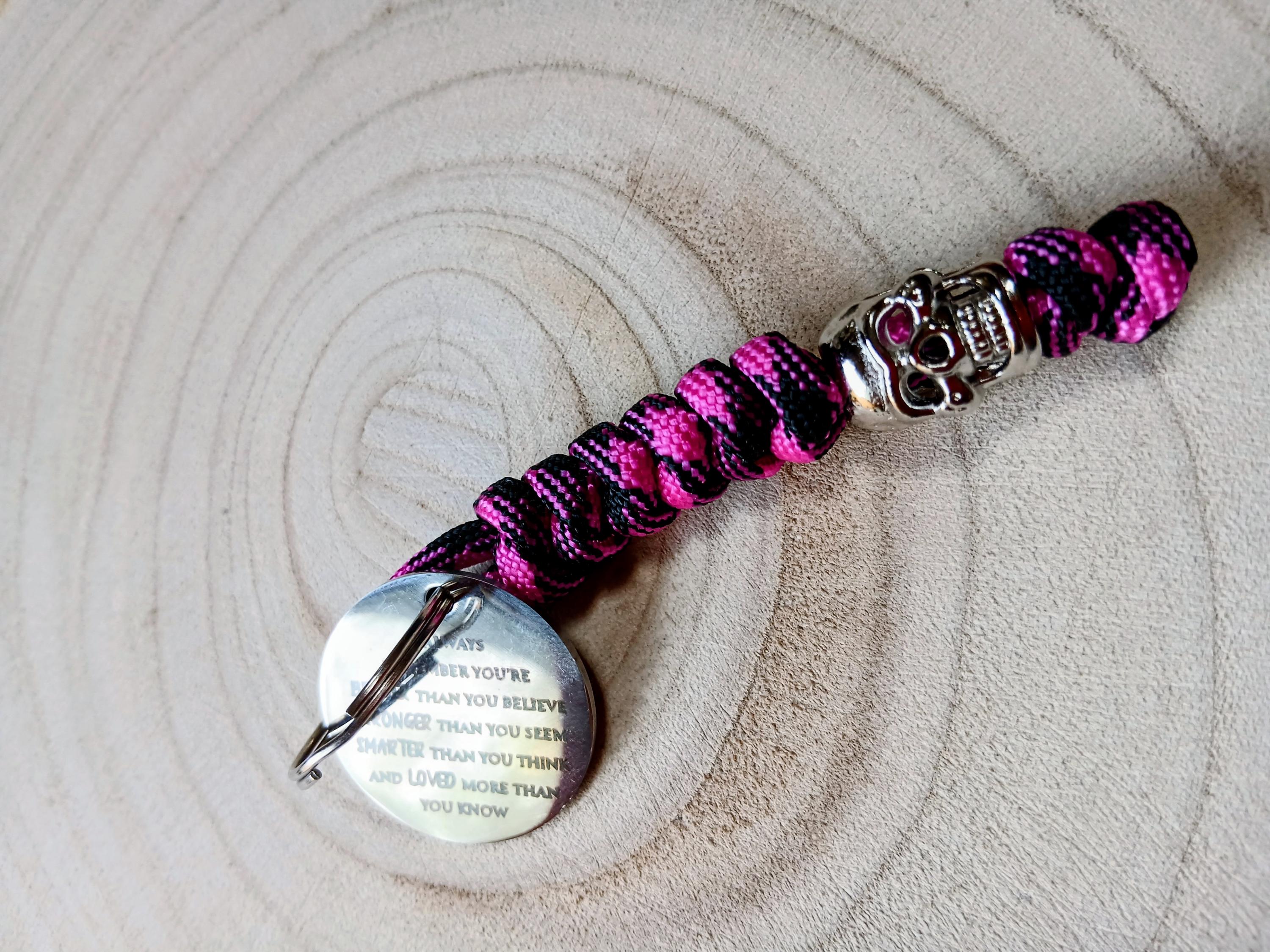 Handmade with bold black and pink paracord, this keyring combines gothic style with a touch of inspiration. The detailed skull bead adds an edgy statement, while the attached metal fob carries an uplifting message: