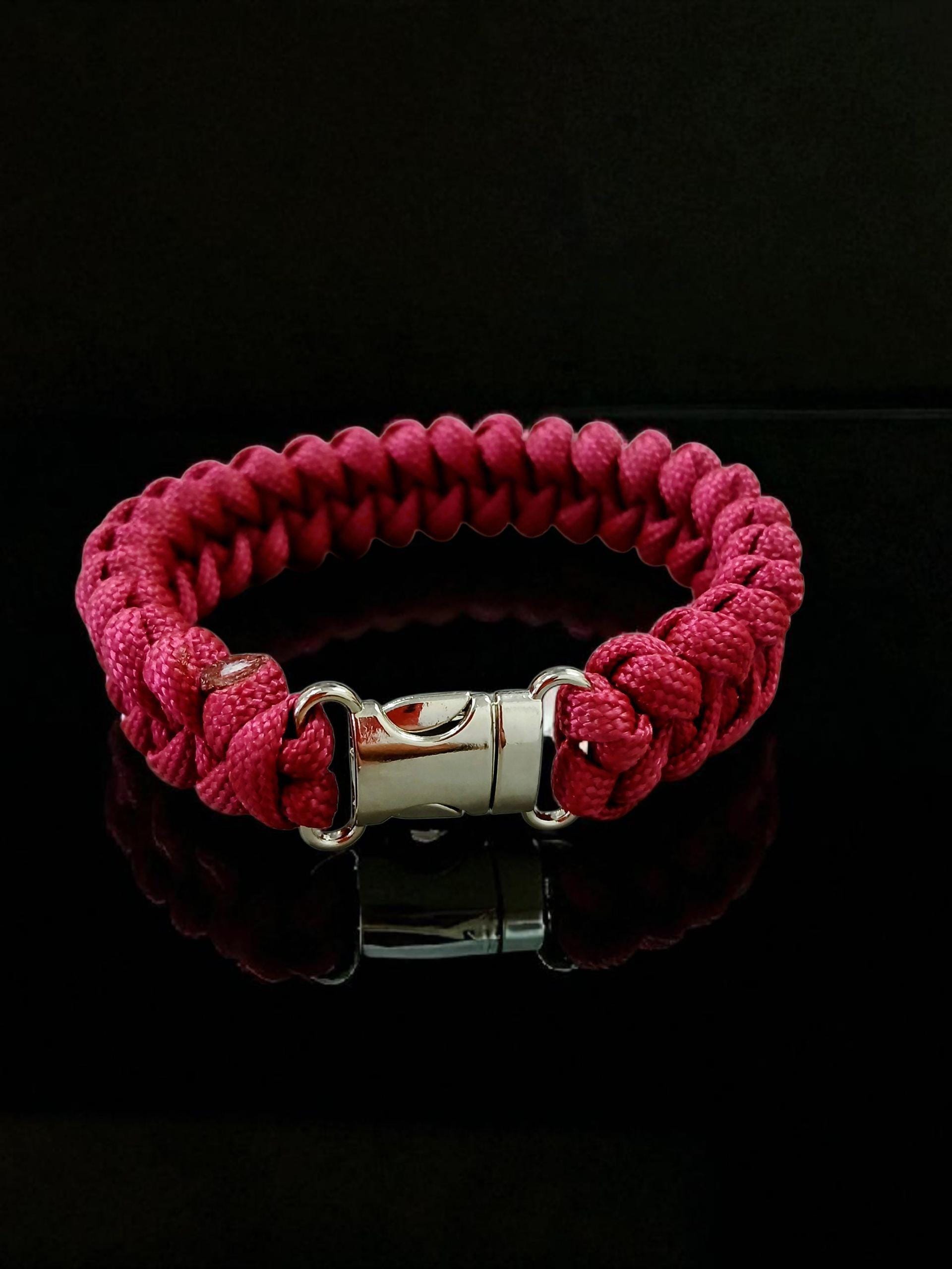 The Crimson Steel Paracord Bracelet is a handmade statement piece, woven from rich crimson-red paracord and finished with a polished stainless steel clasp. Its bold colour makes it perfect for those who want a bracelet that stands out while keeping a clean and minimalist design.
