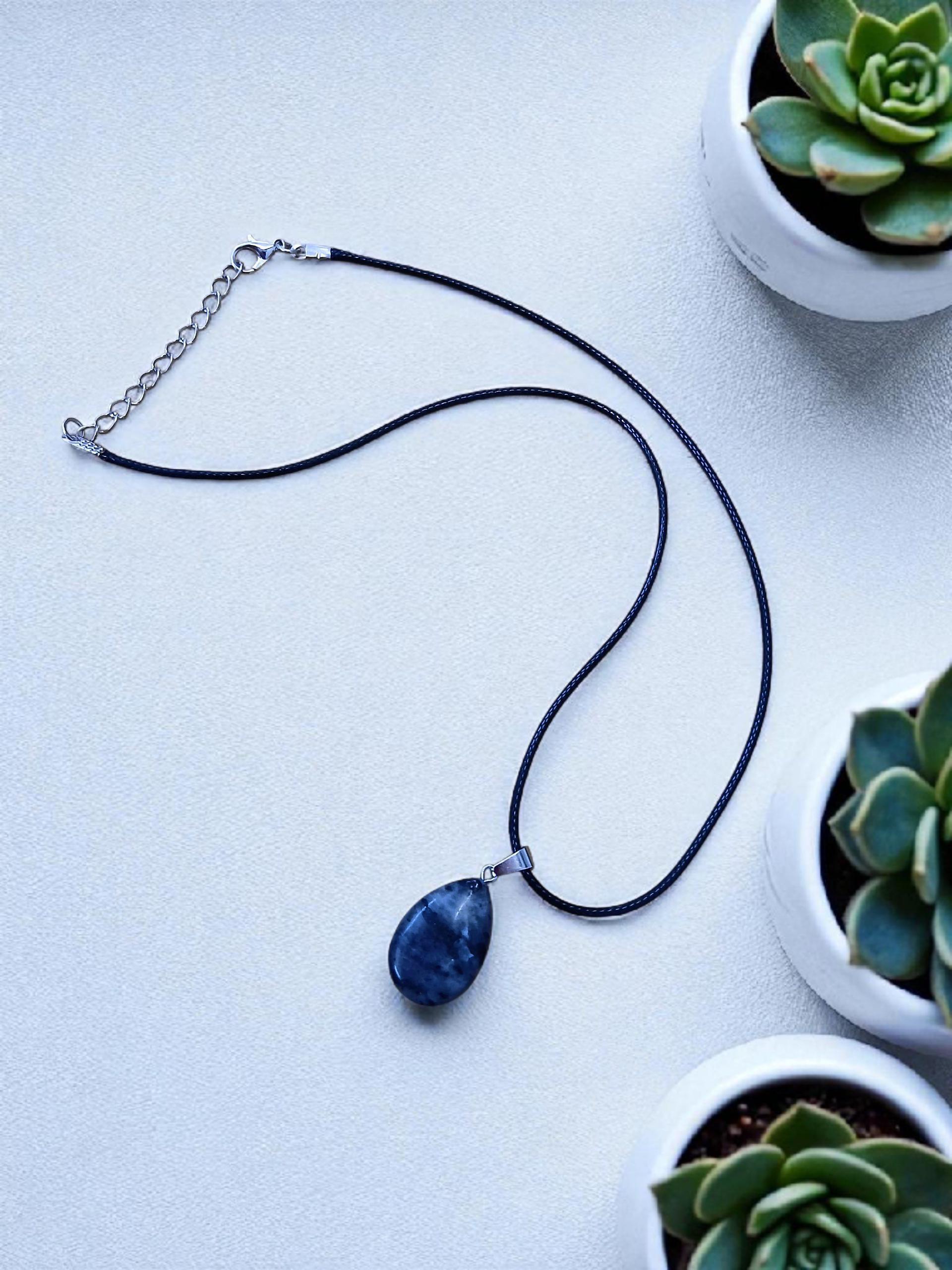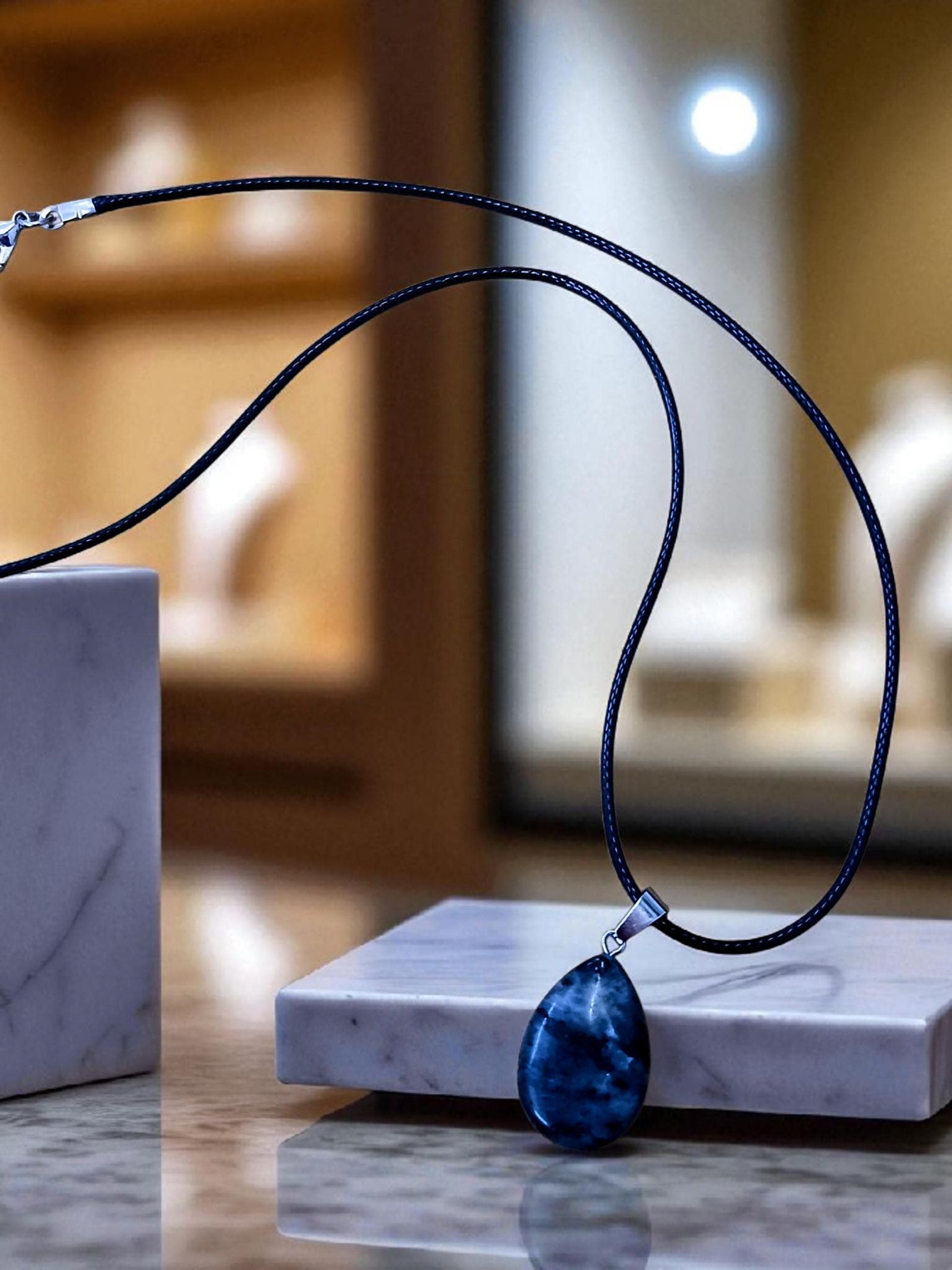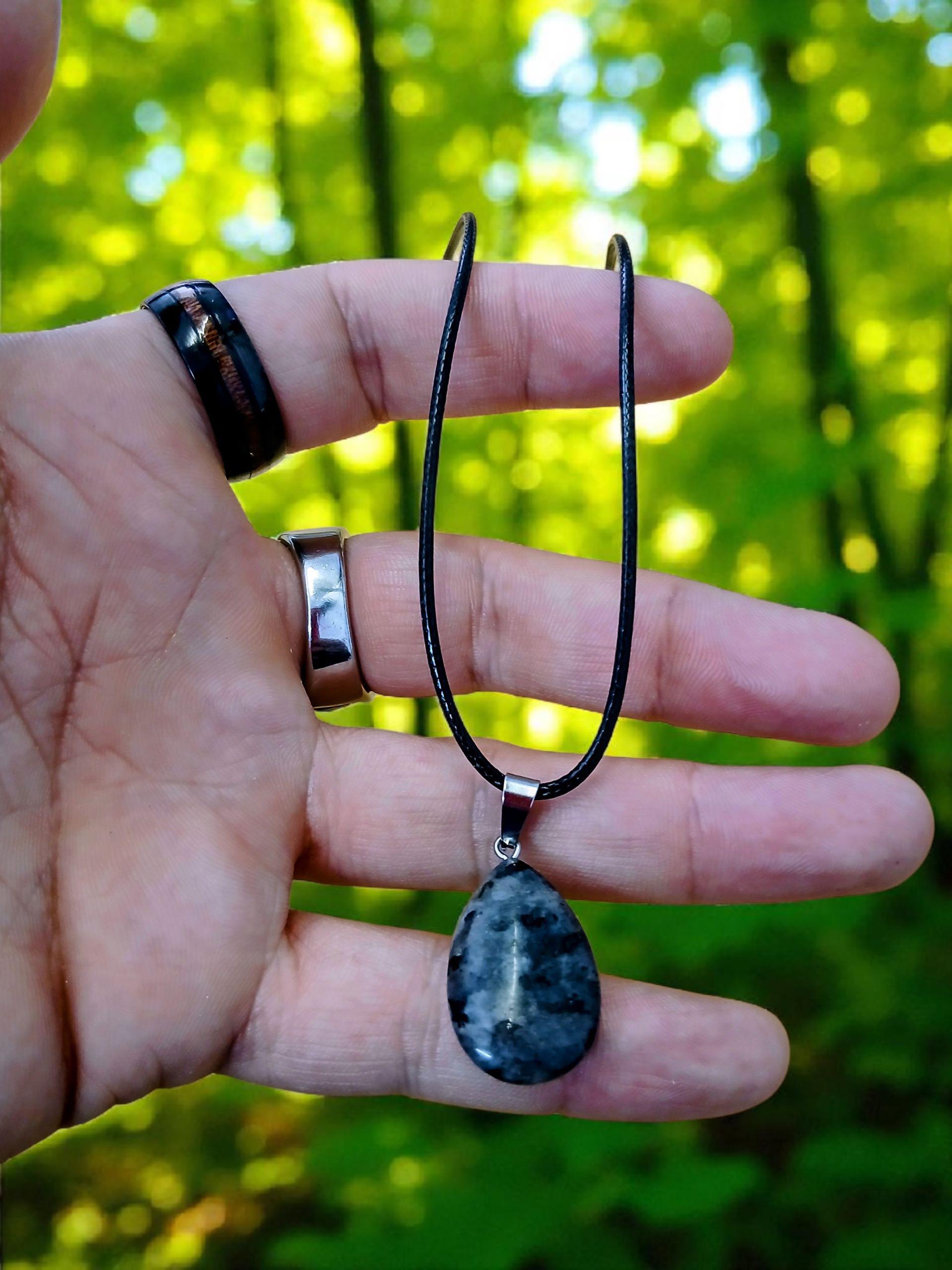 Embrace the grounding energy of the Grey & Midnight Larvikite Teardrop Pendant Necklace. Handcrafted with a natural polished larvikite gemstone, this striking pendant reveals dark grey and black patterns, highlighted by subtle flashes of silver-blue when caught in the light — often mistaken for labradorite, larvikite is its own unique stone.