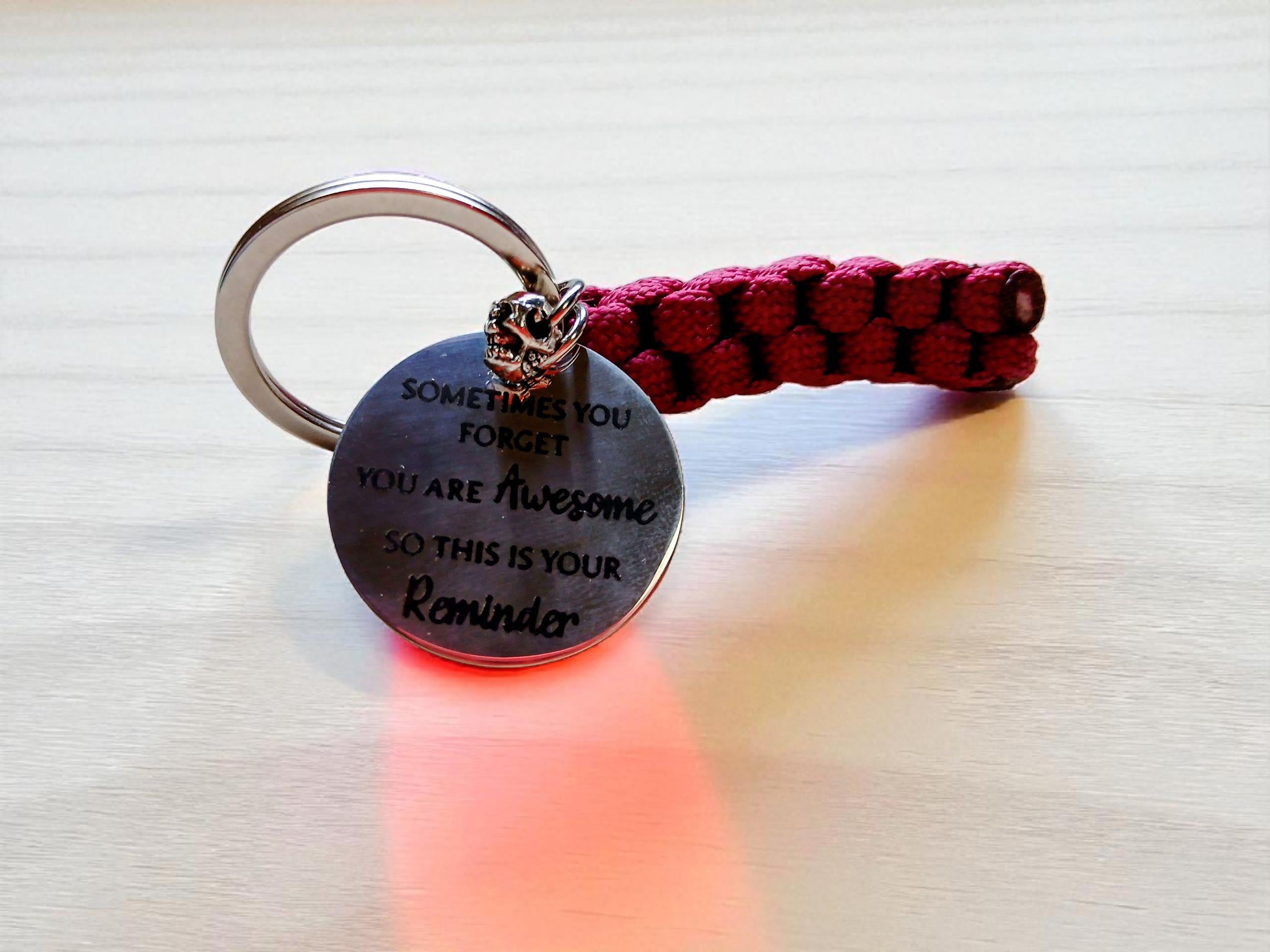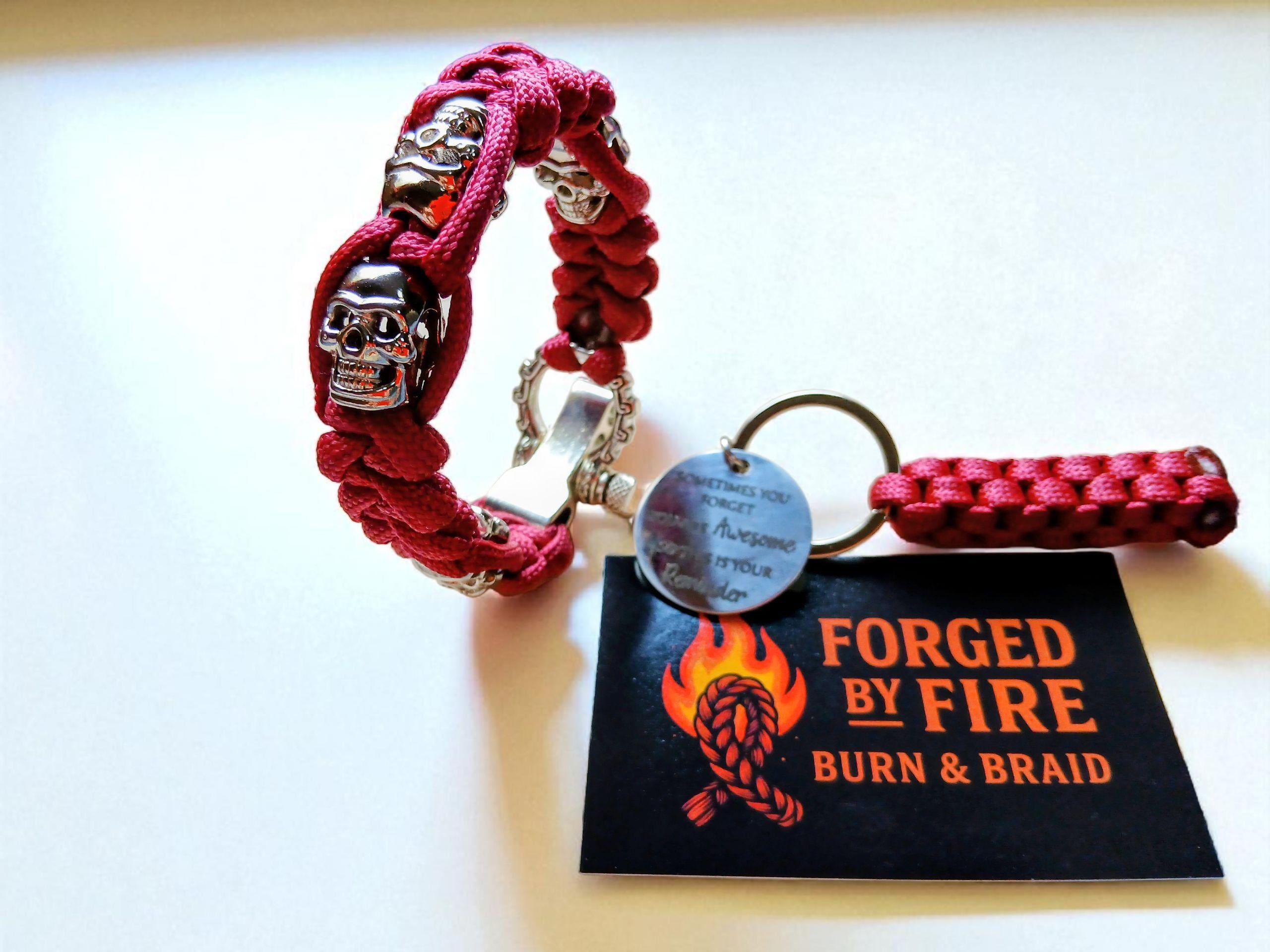 This handmade gift set includes a bold red paracord bracelet, woven with polished silver skull beads and finished with a detailed engraved shackle clasp. The matching keyring continues the theme, featuring a small skull and an engraved fob that reads: