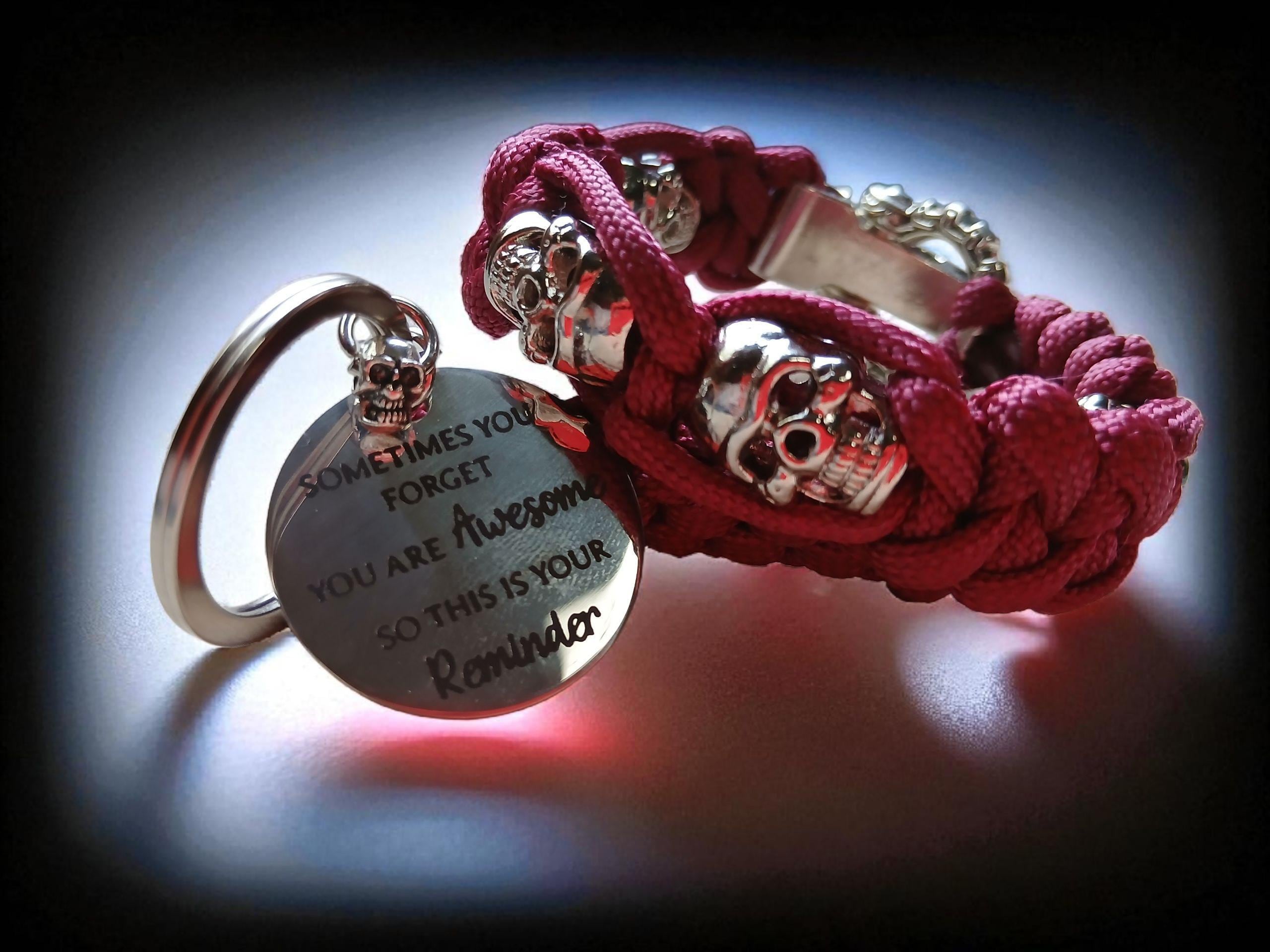 Material: 550 paracord, engraved clasp, silver-tone skull beads, engraved keyring fob