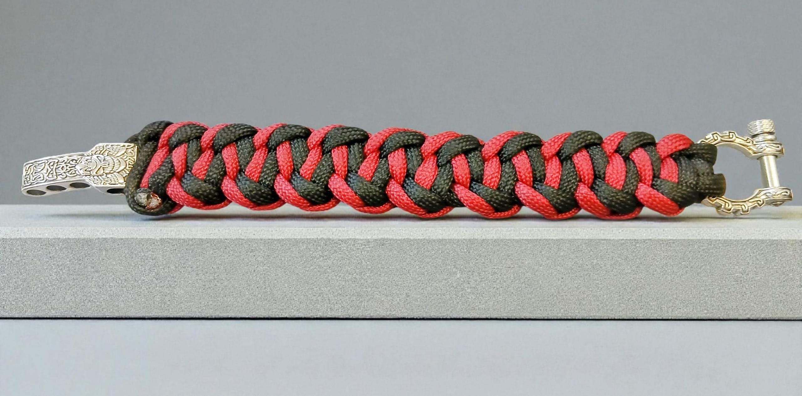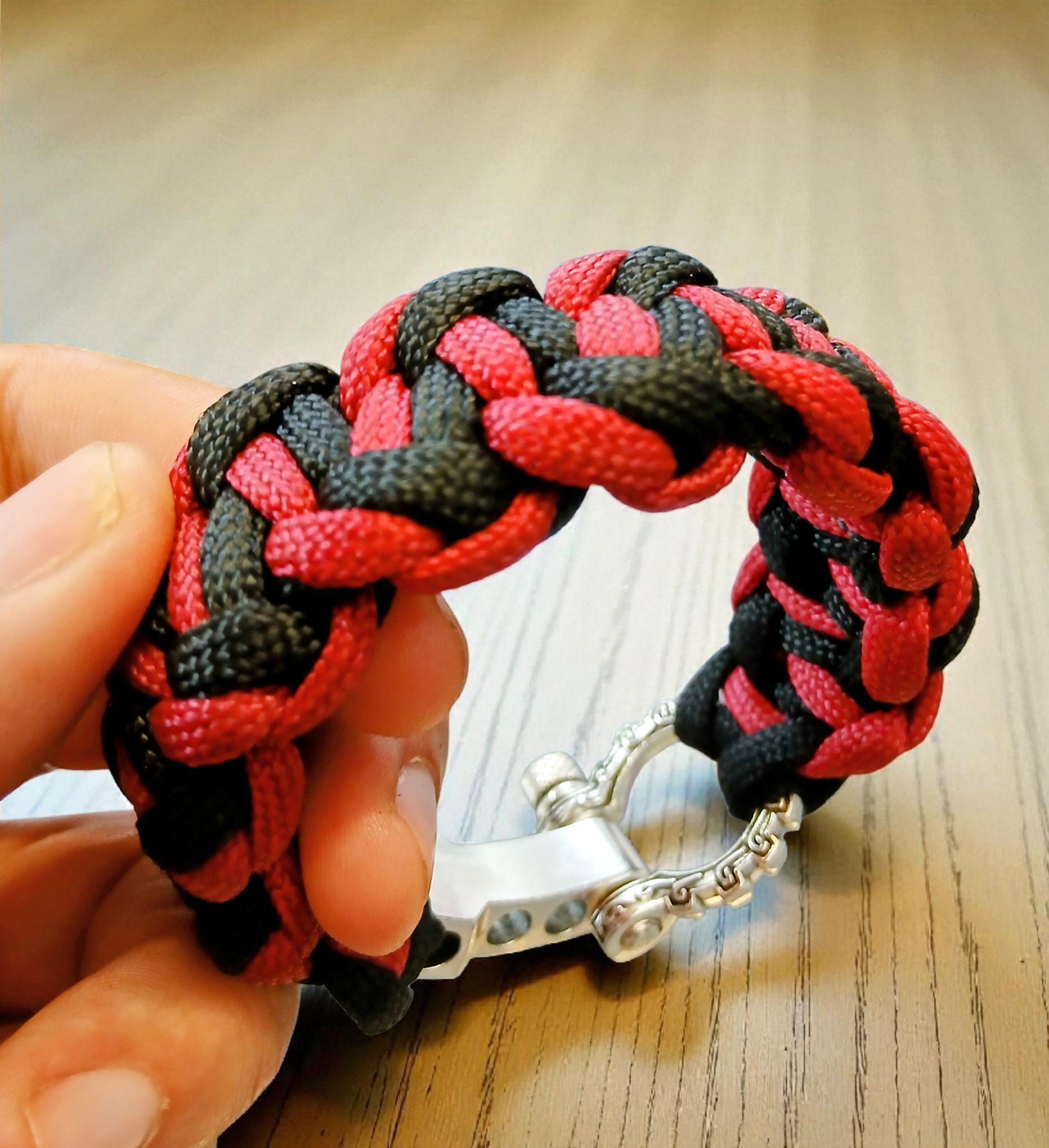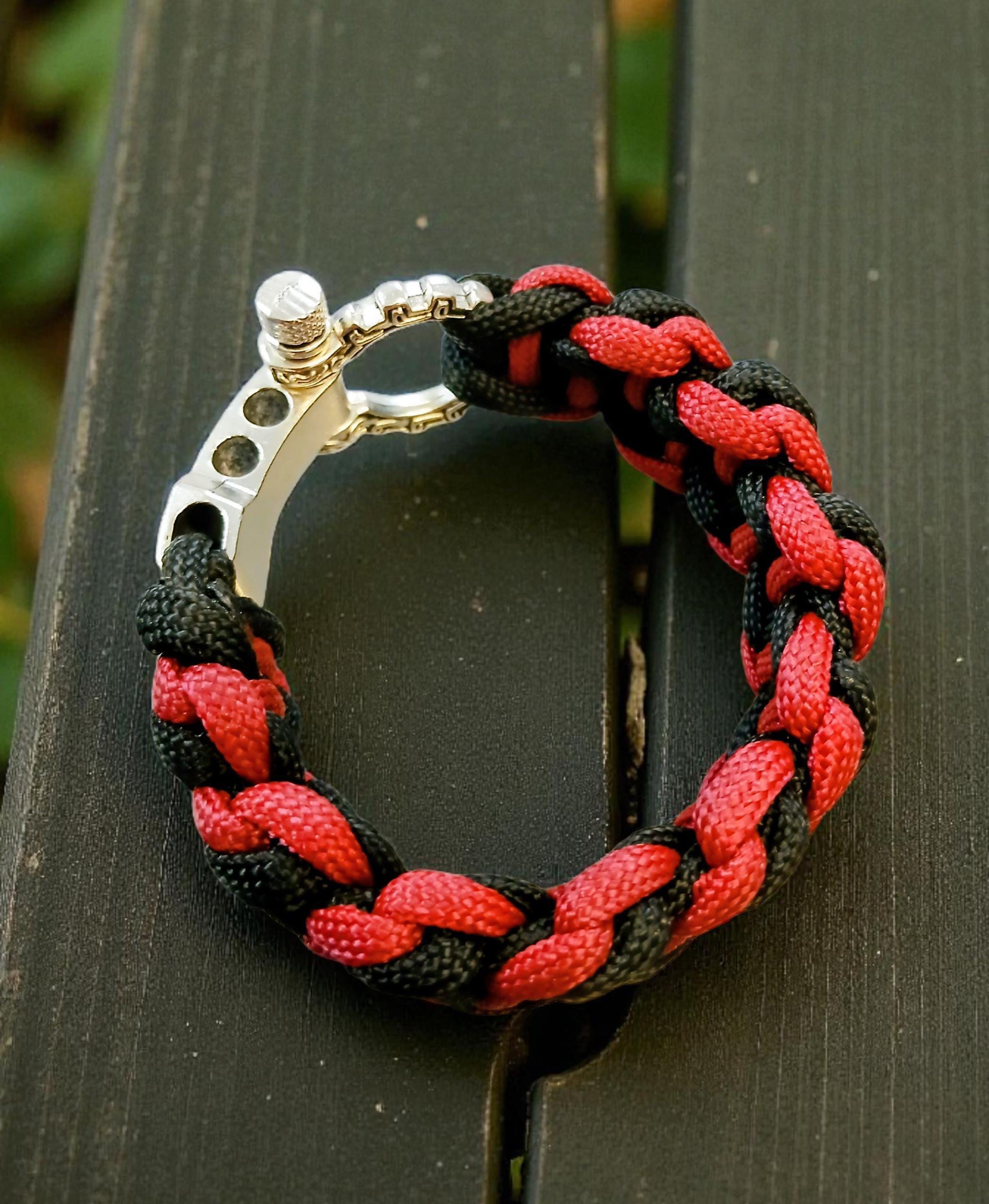Braided from premium 550 paracord in deep crimson and black, it embodies raw power and quiet discipline. The polished metal shackle clasp adds a rugged yet refined finish — a true symbol of endurance and resolve.