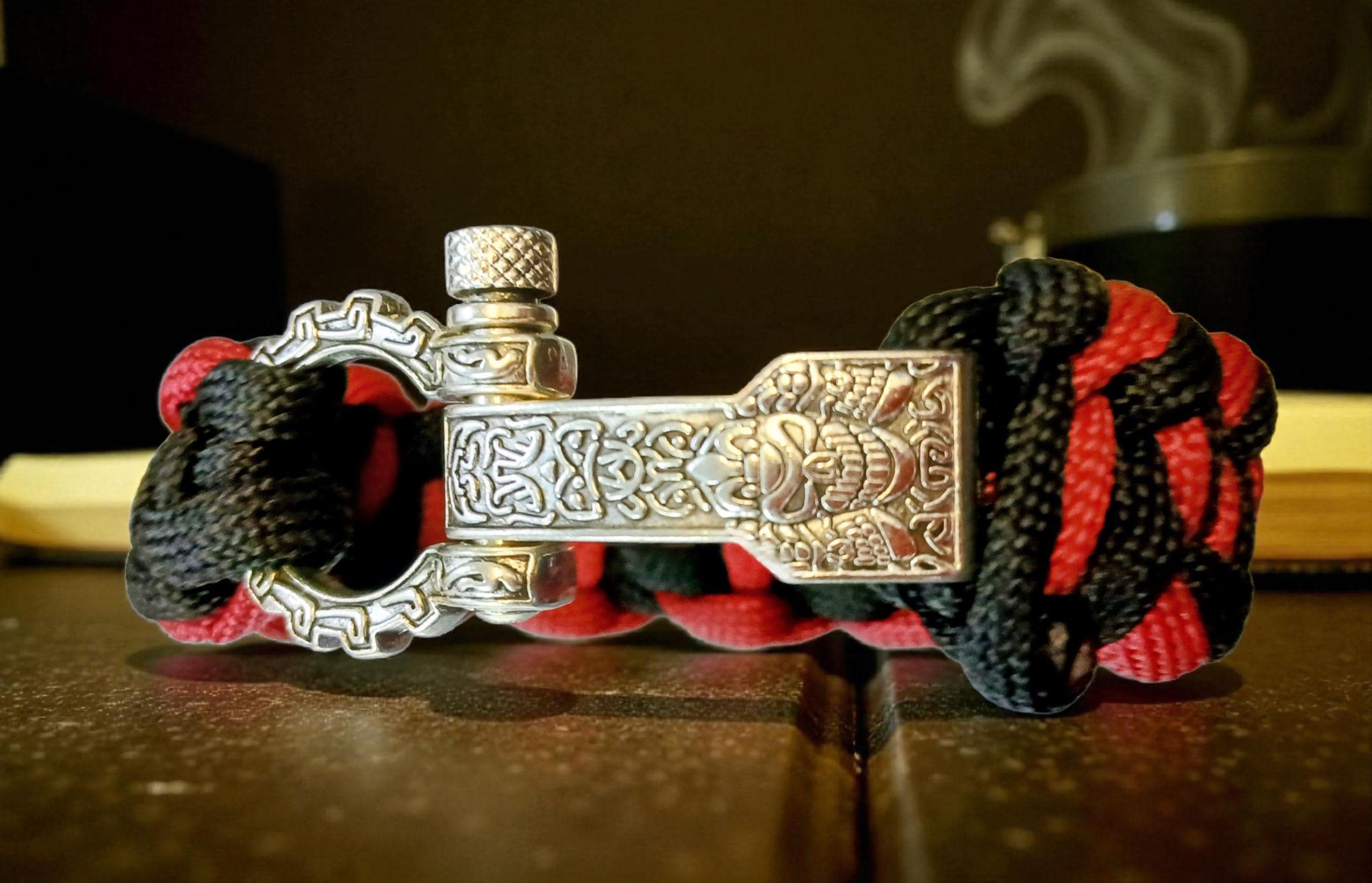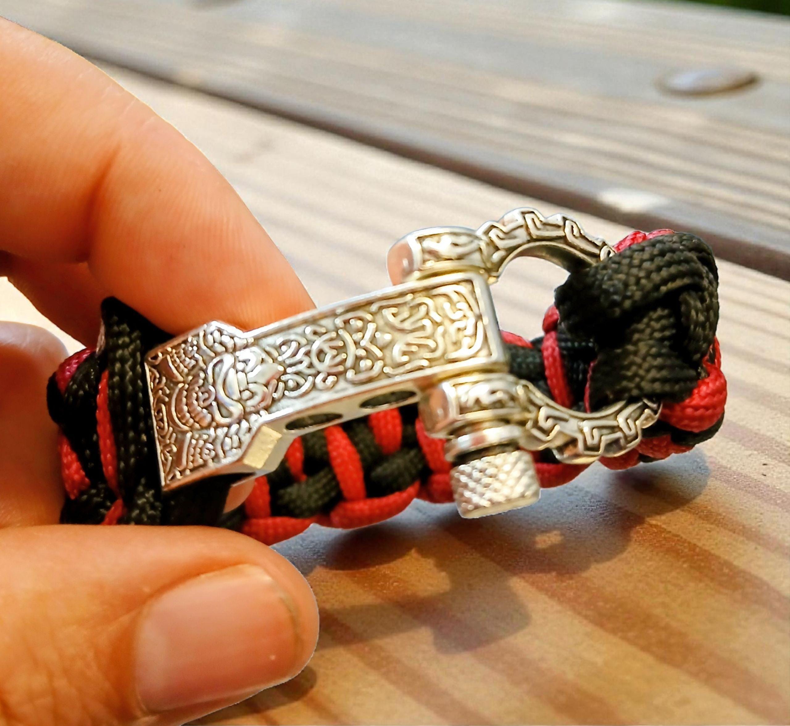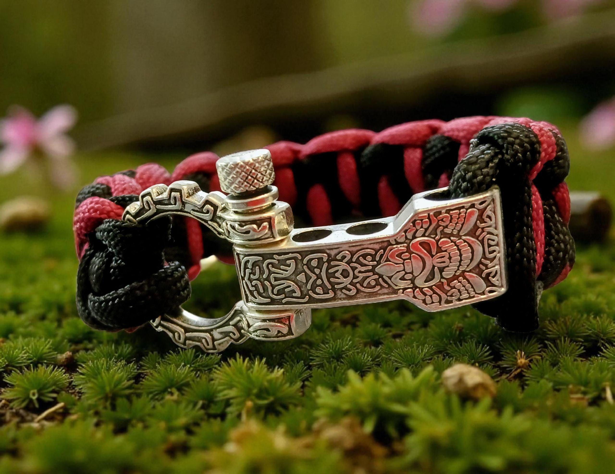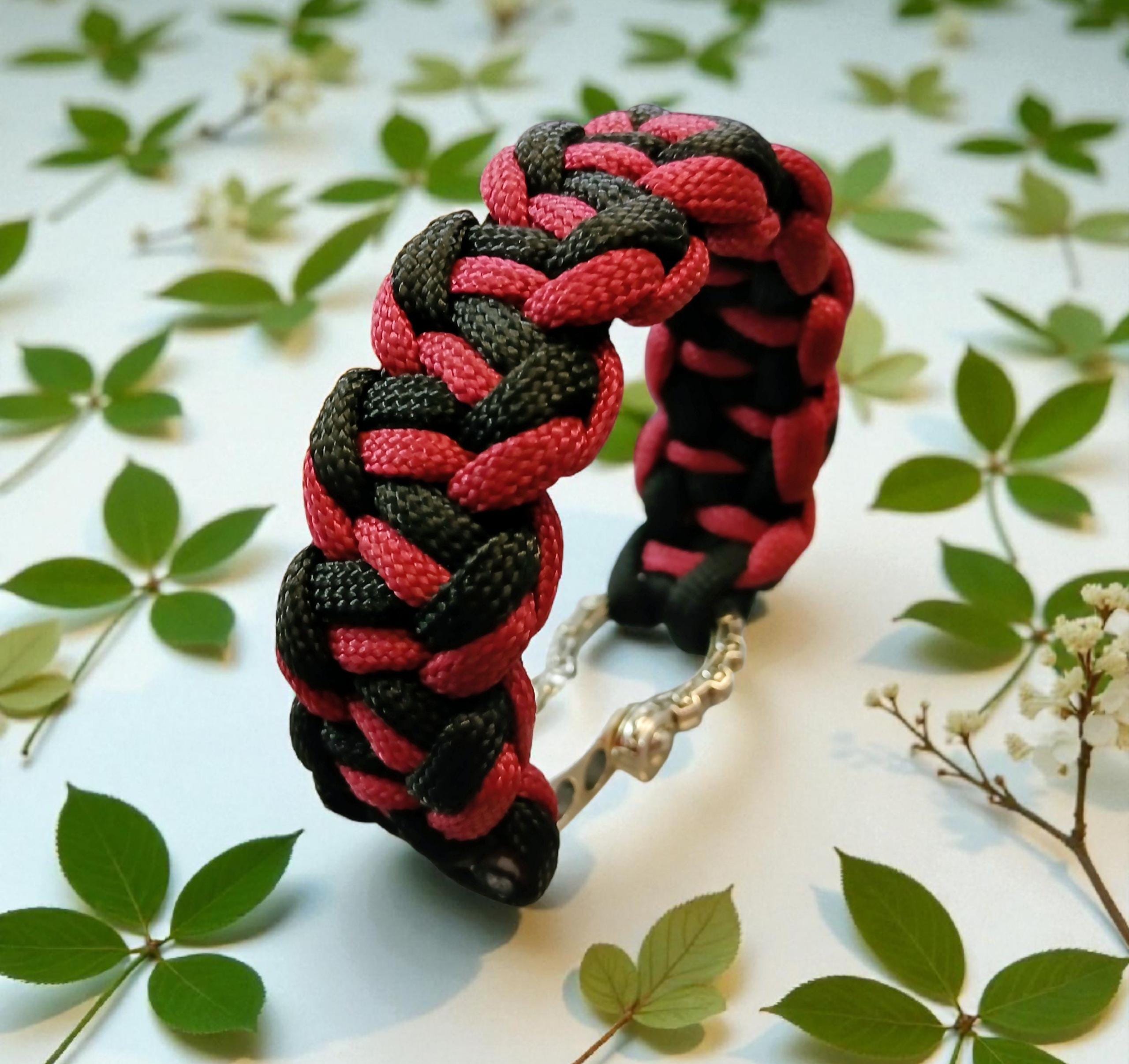 Braided from premium 550 paracord in deep crimson and black, it embodies raw power and quiet discipline. The polished metal shackle clasp adds a rugged yet refined finish — a true symbol of endurance and resolve.