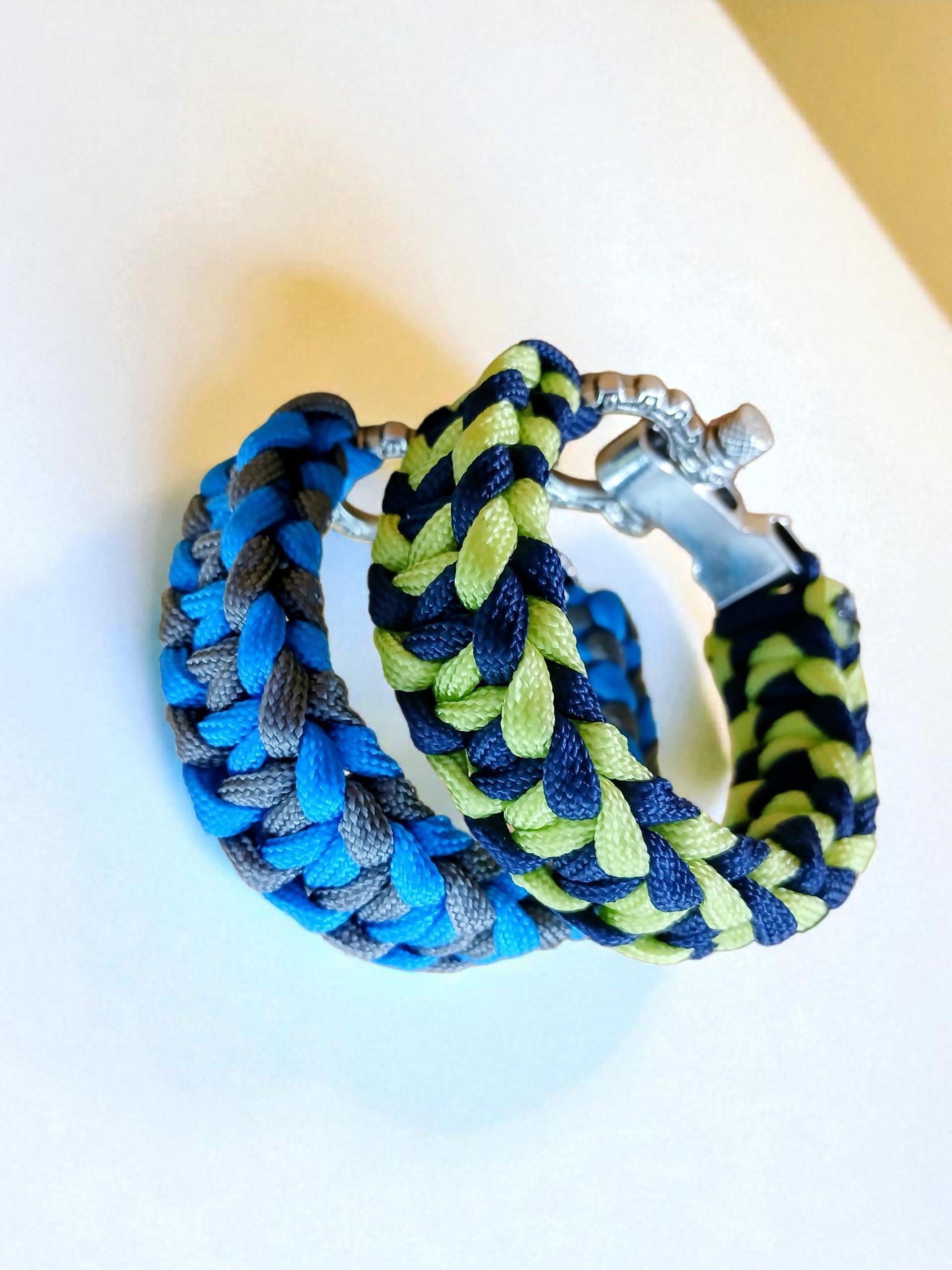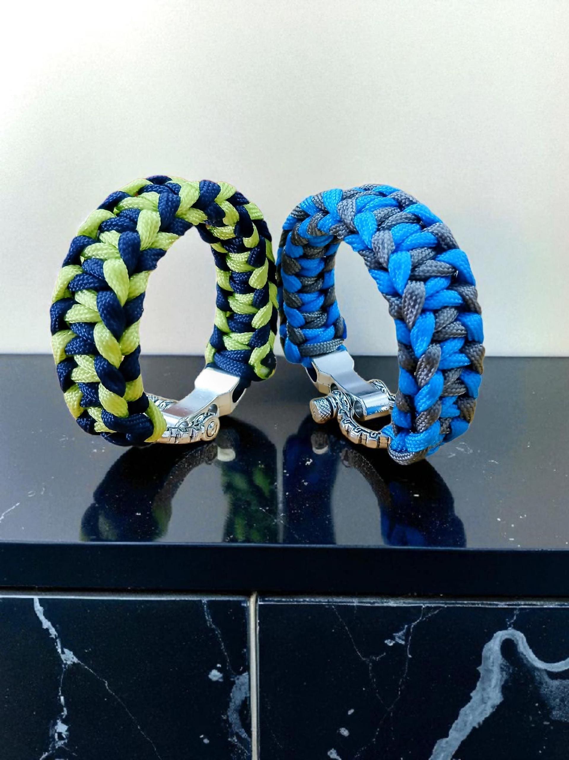 Featuring a detailed Norse/Celtic style shackle clasp, these bracelets bring together heritage and resilience in one striking accessory. Whether you choose the Black & Neon Yellow or Sky Blue & Silver variant, each piece is made to order with care and precision.