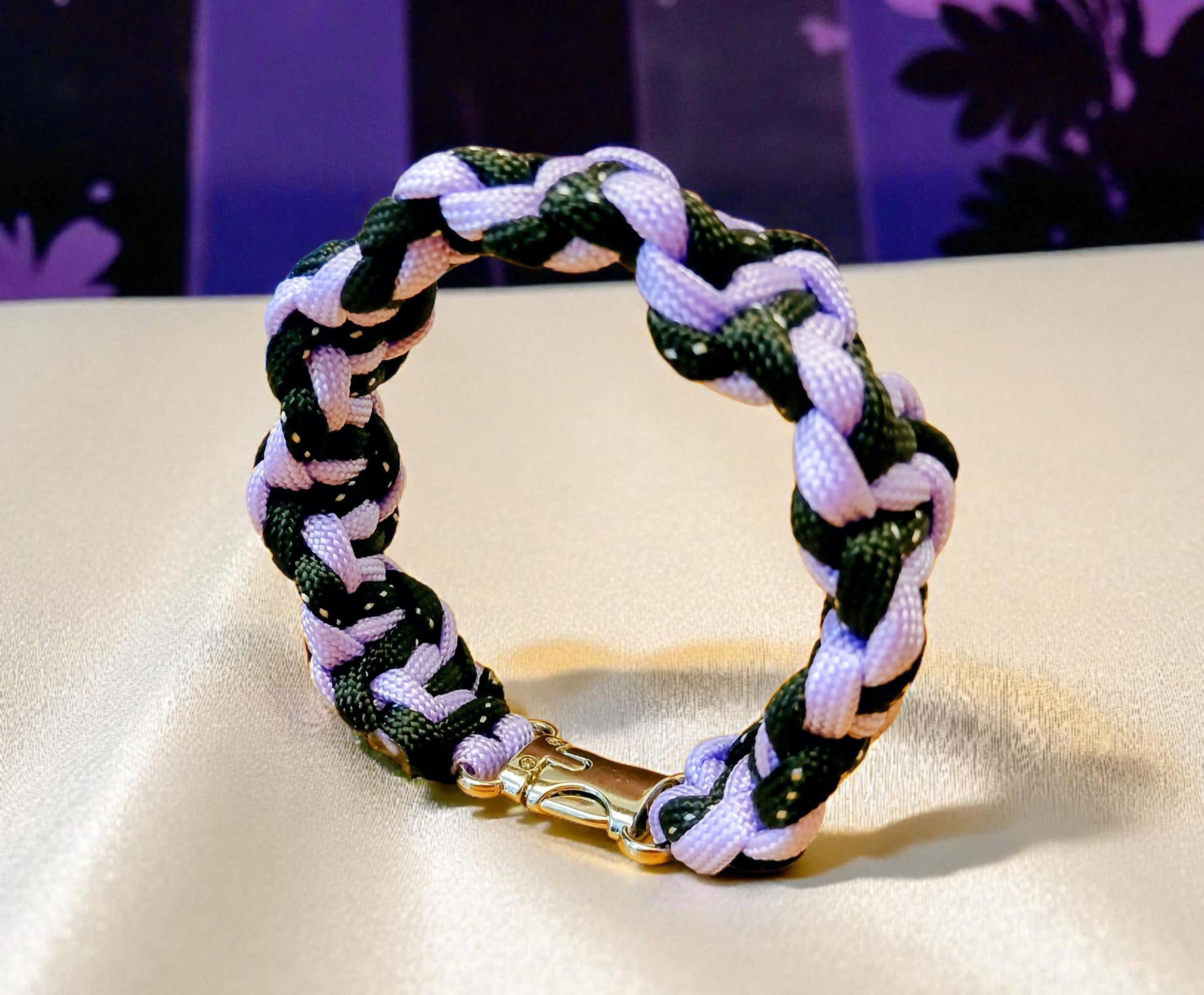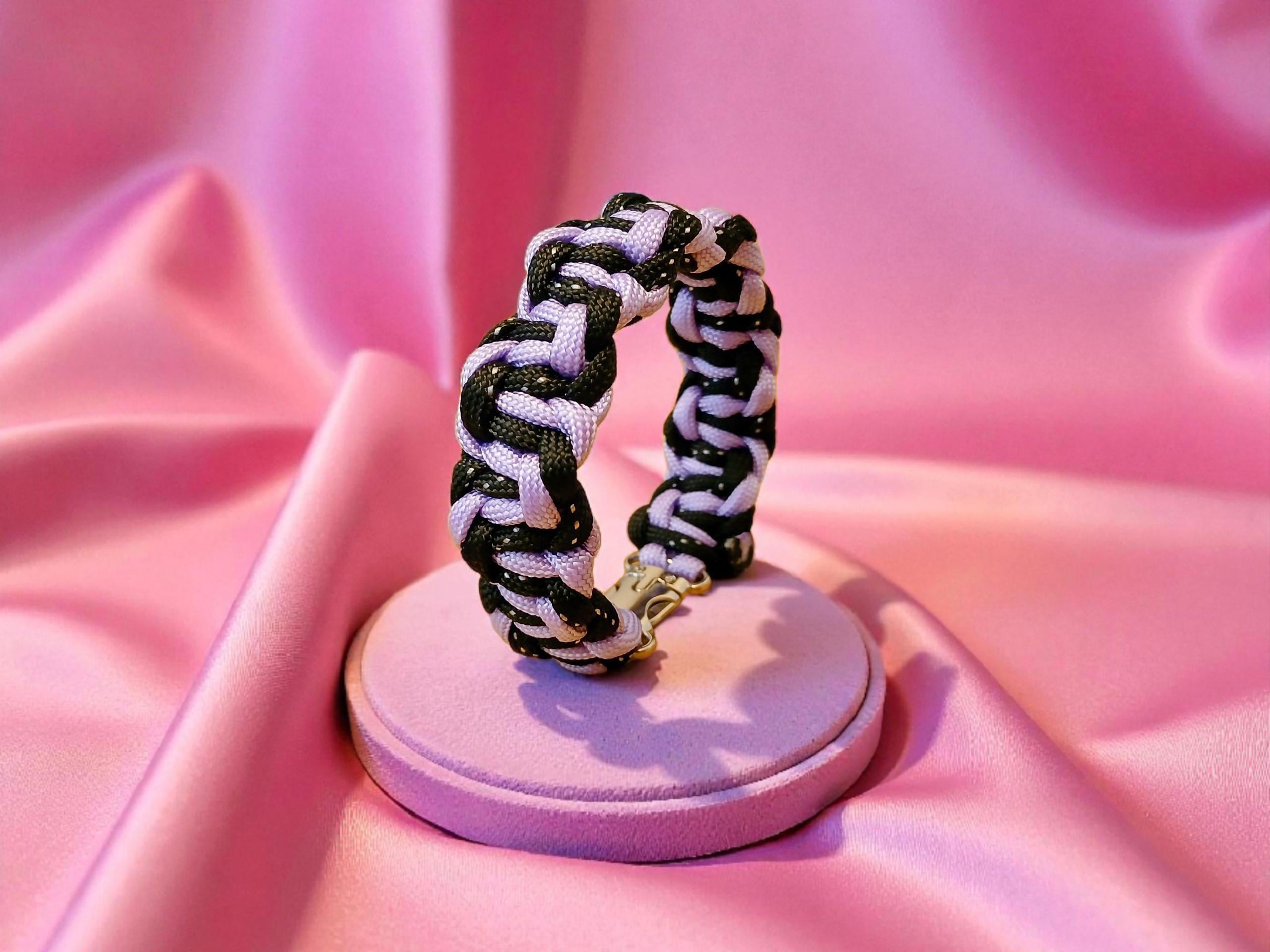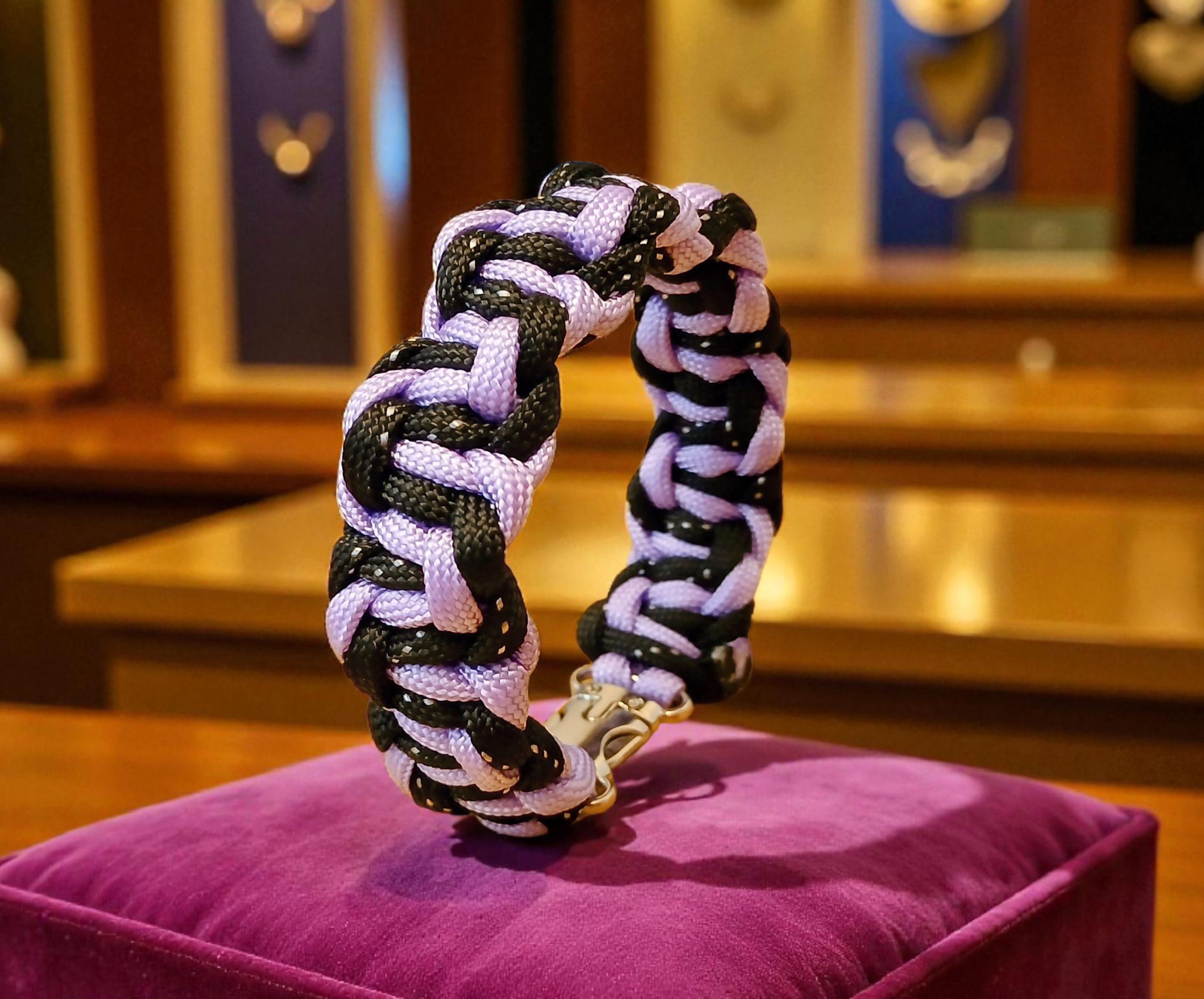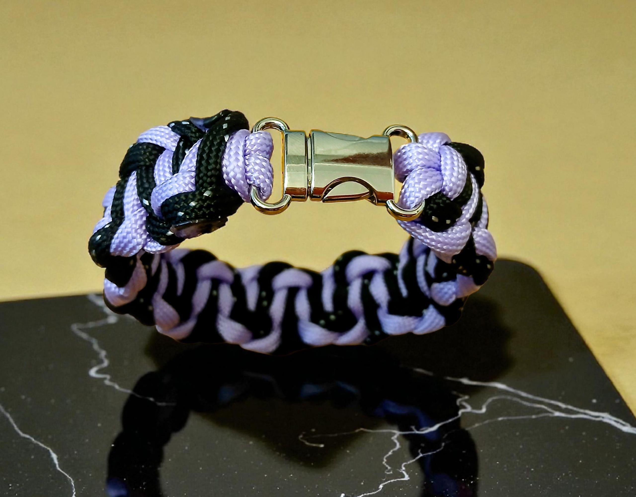 Handcrafted with precision and purpose, The Amethyst Shadow blends the calm of twilight with the strength of night. This bold paracord bracelet features a unique interwoven pattern of lavender, and midnight black, finished with a polished metal clasp for secure everyday wear.