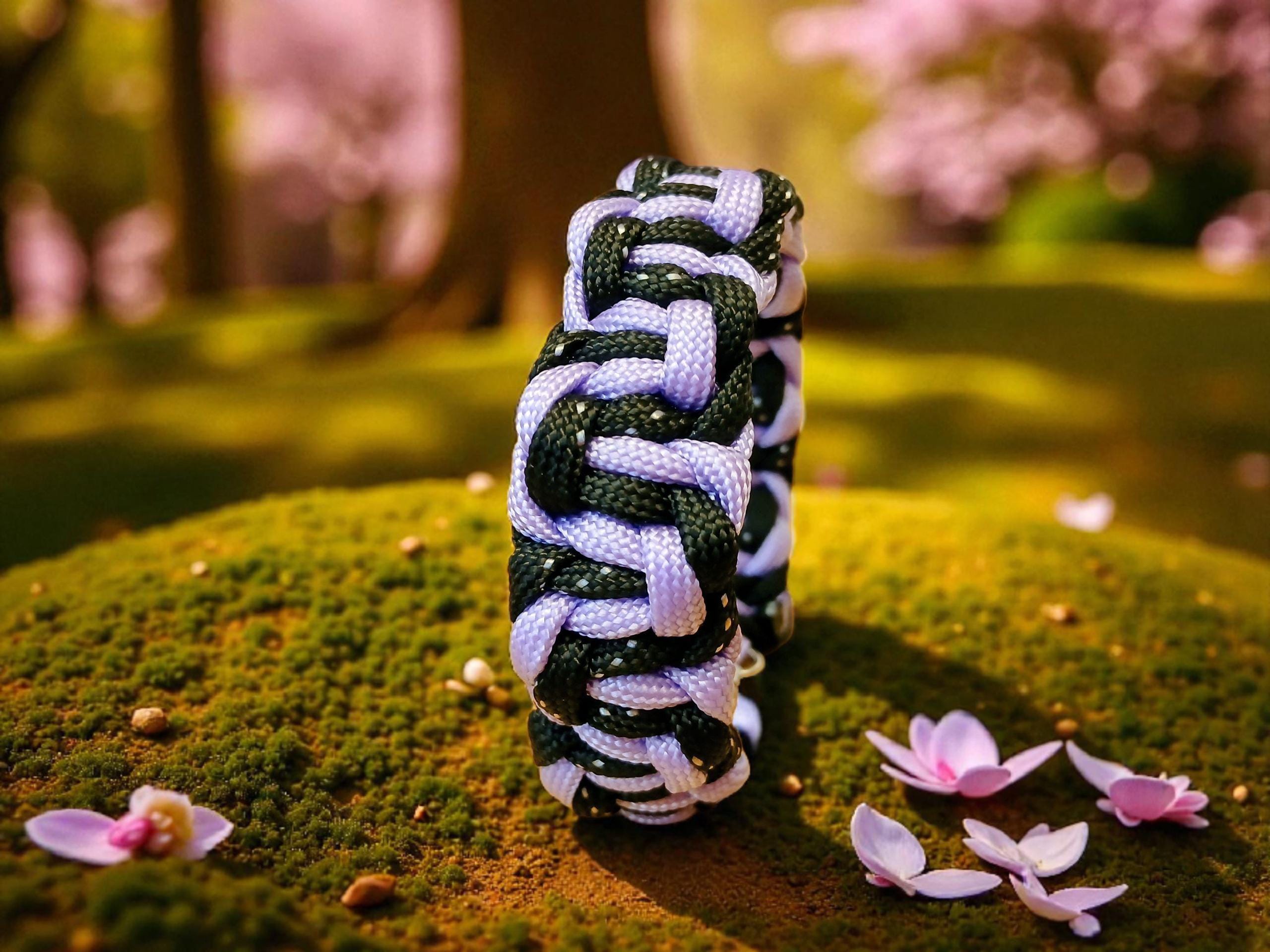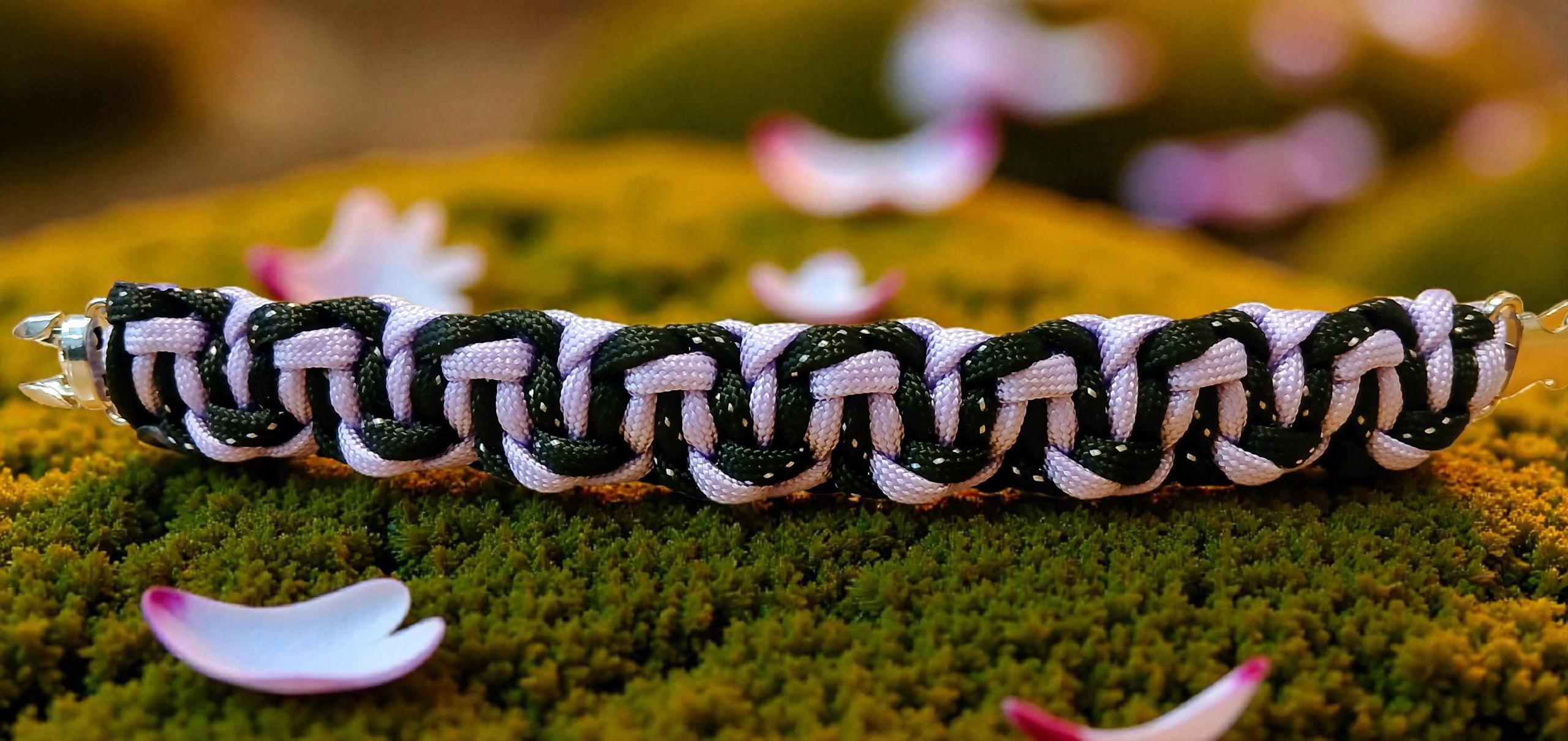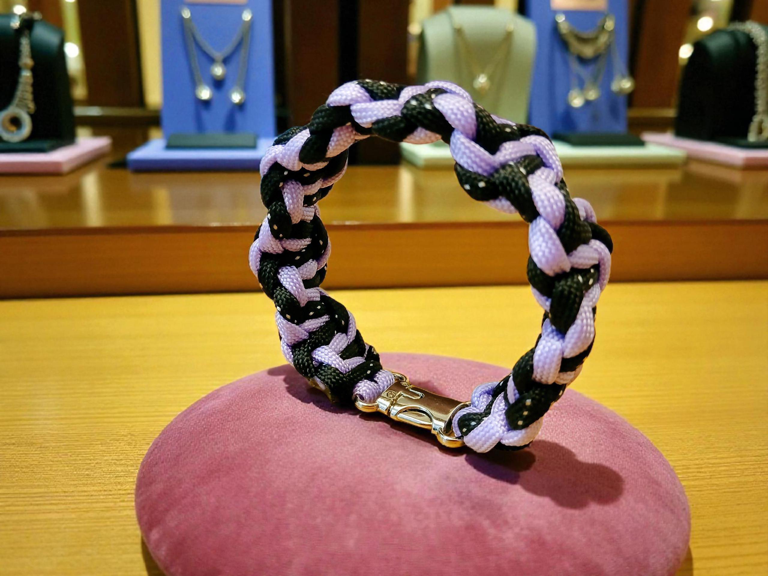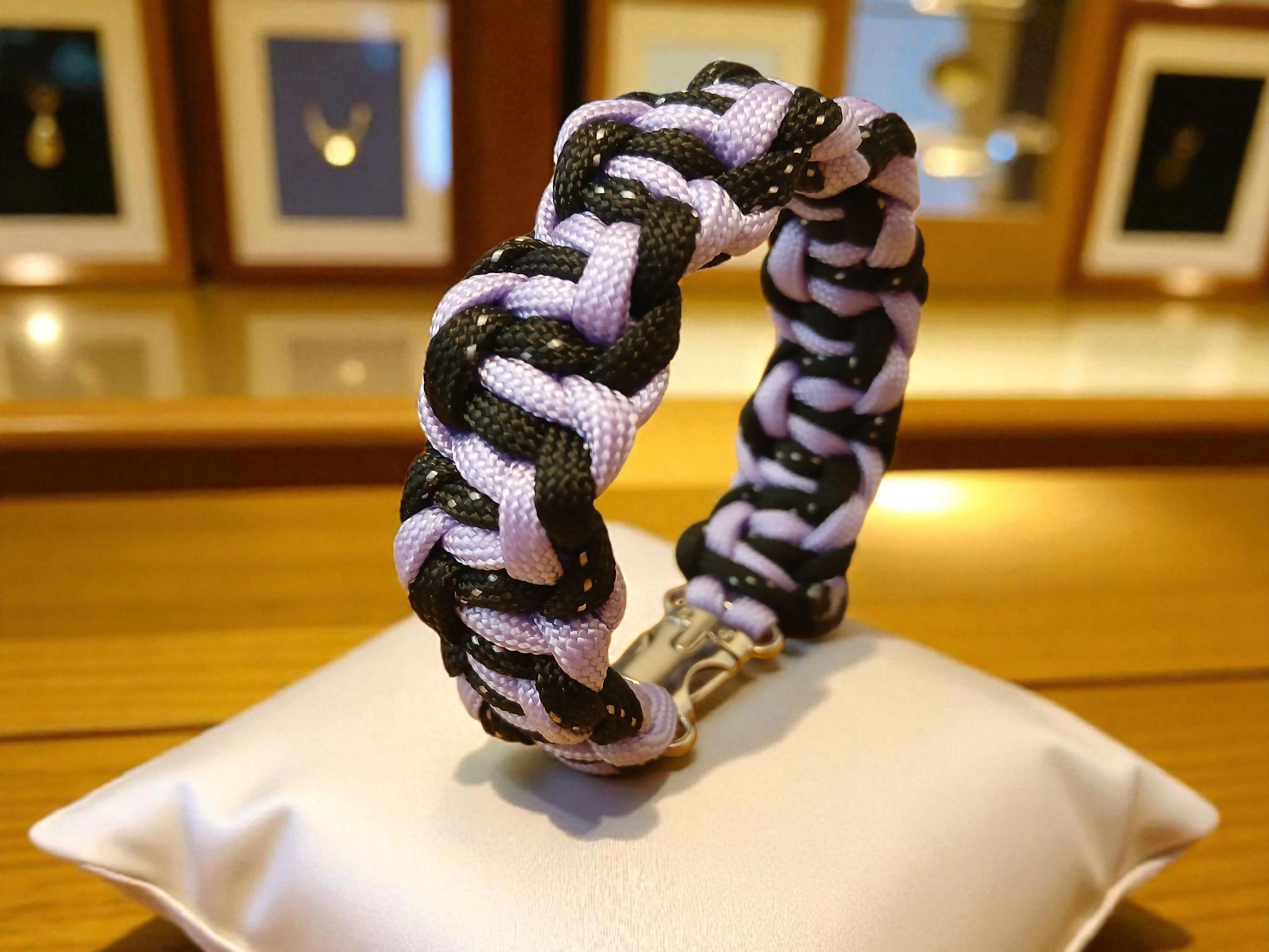 Handcrafted with precision and purpose, The Amethyst Shadow blends the calm of twilight with the strength of night. This bold paracord bracelet features a unique interwoven pattern of lavender, and midnight black, finished with a polished metal clasp for secure everyday wear.
