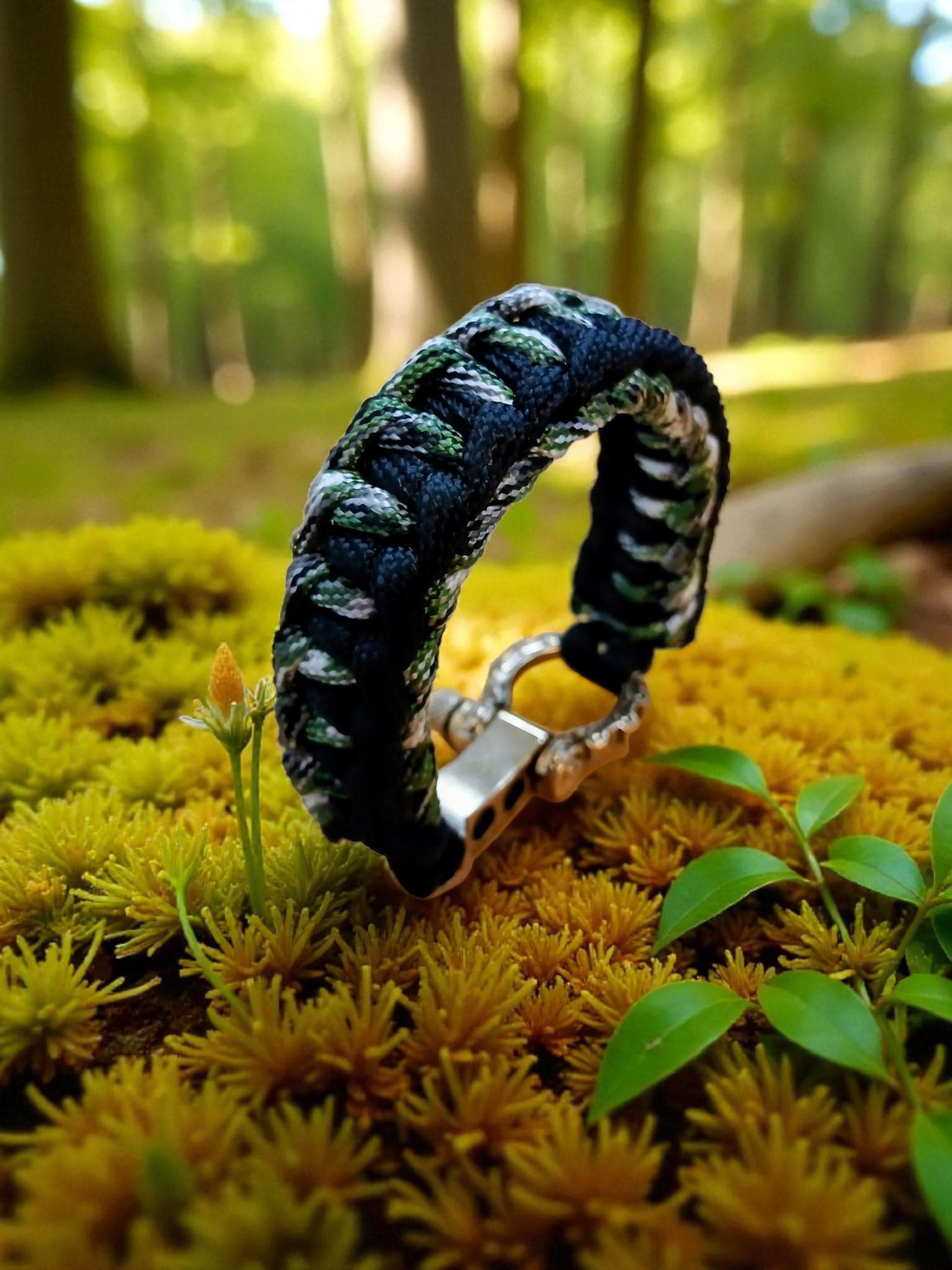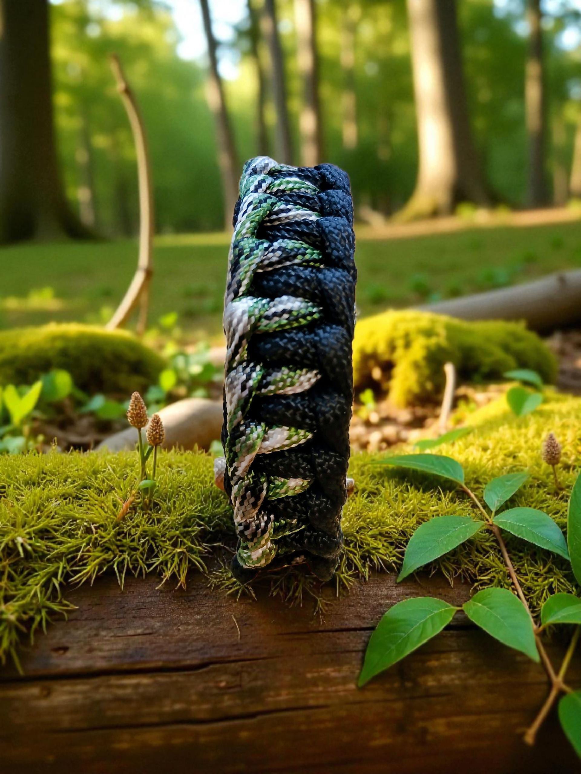 Inspired by the quiet strength of the British woodlands, the Woodland Ranger Paracord Bracelet blends earthy tones with rugged outdoor craftsmanship. Hand-woven using high-quality 550 paracord, the bracelet’s pattern moves through deep black, natural greens and woodland greys — echoing moss, bark, and shadow.