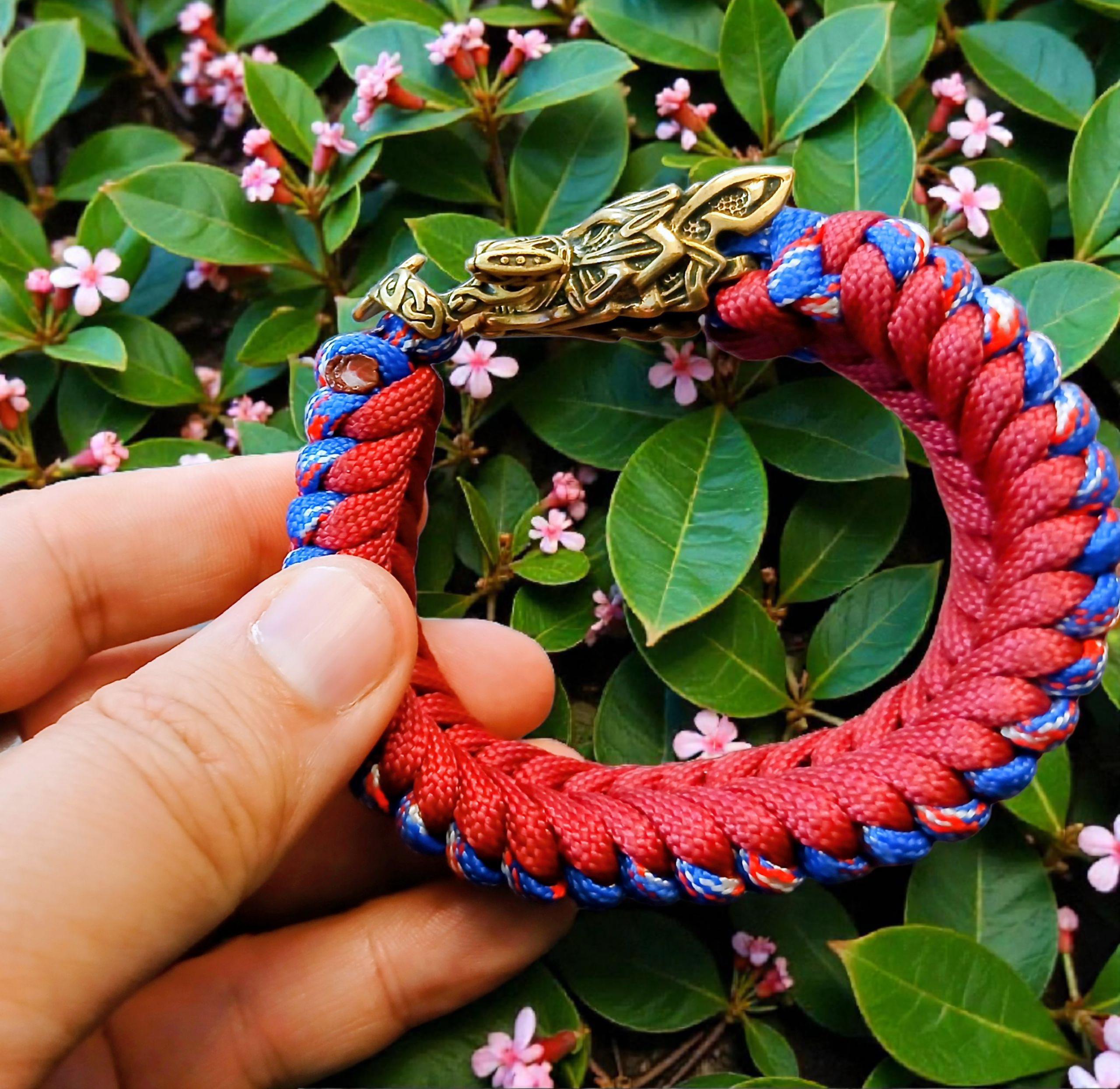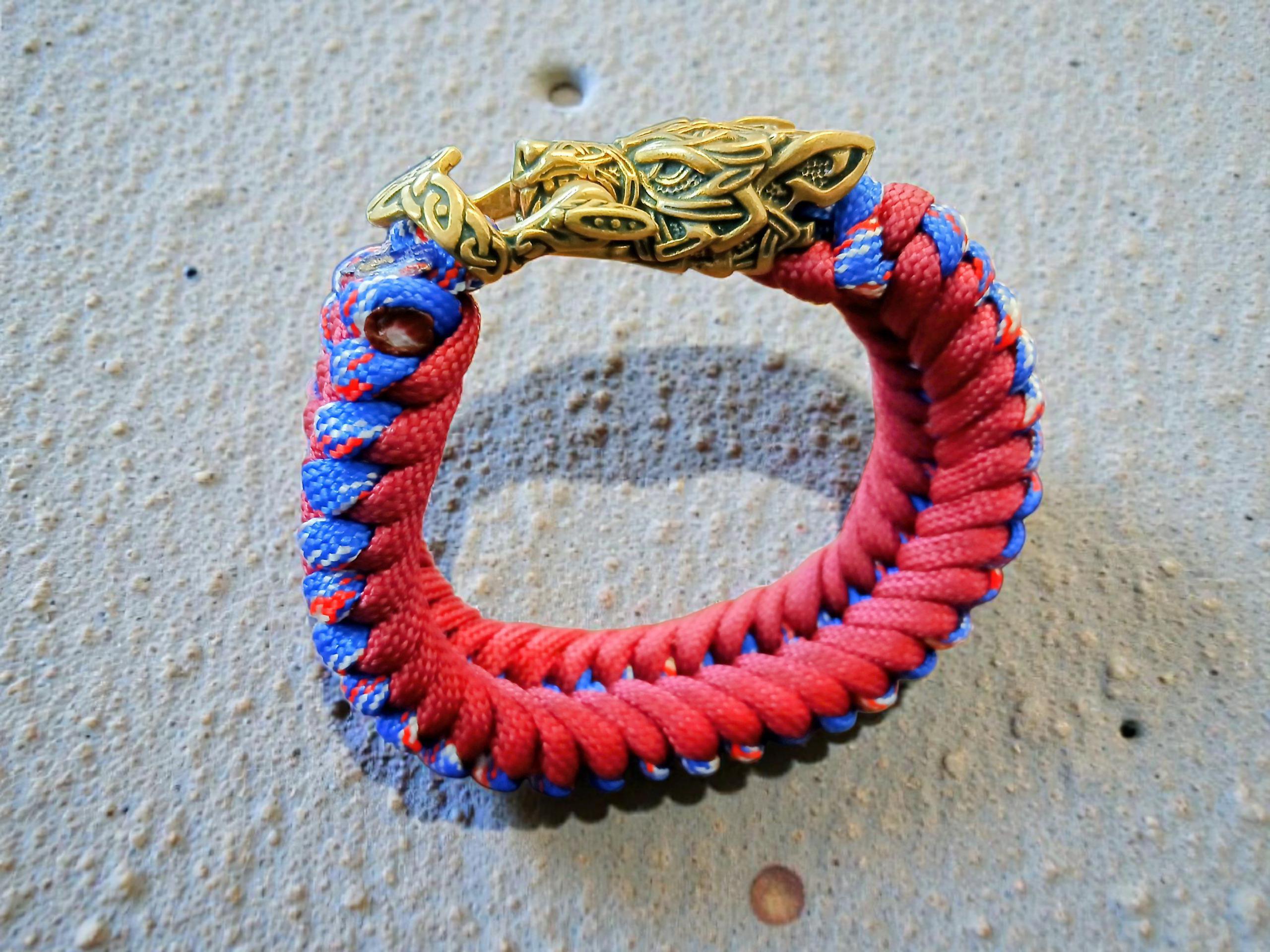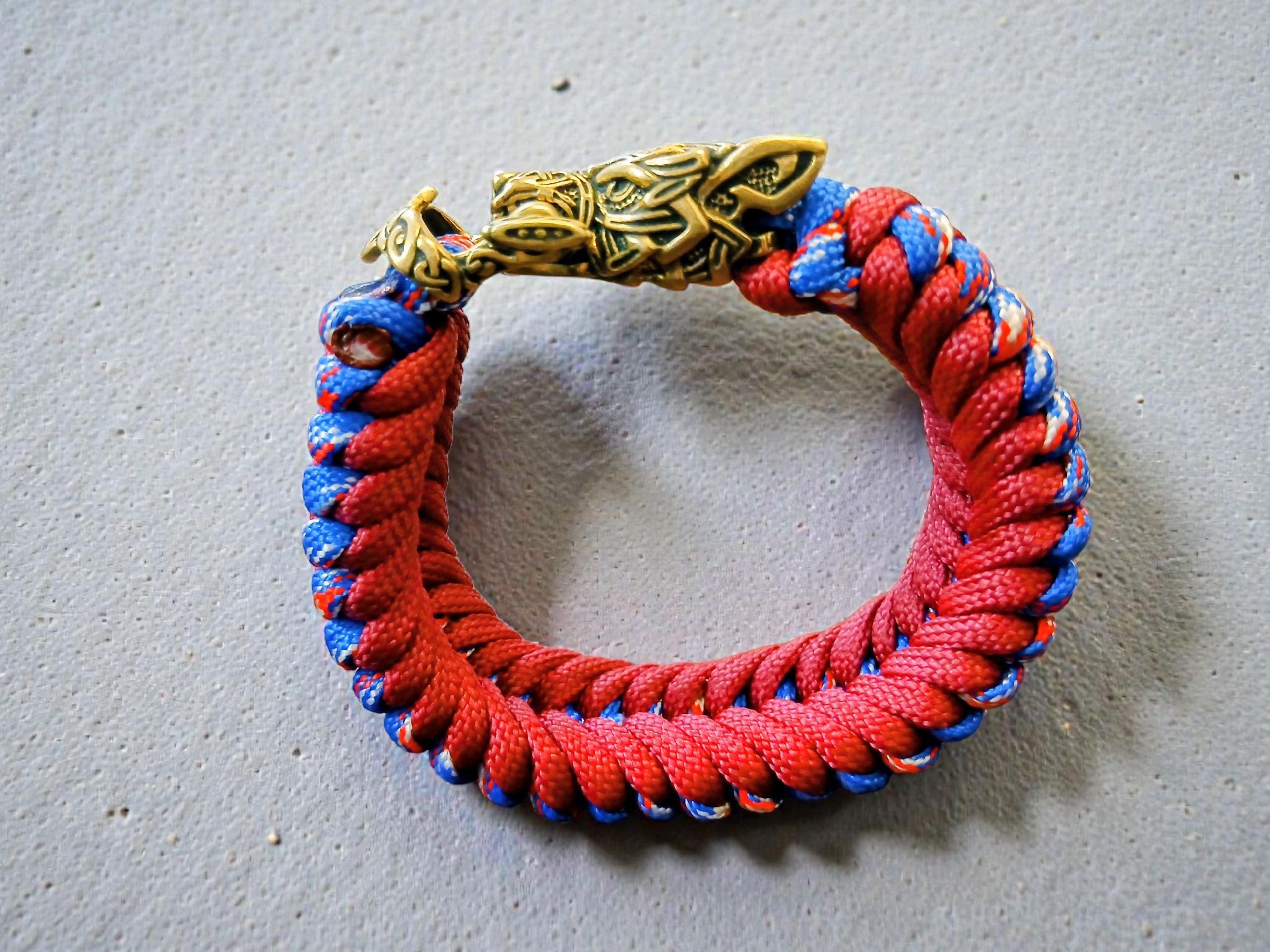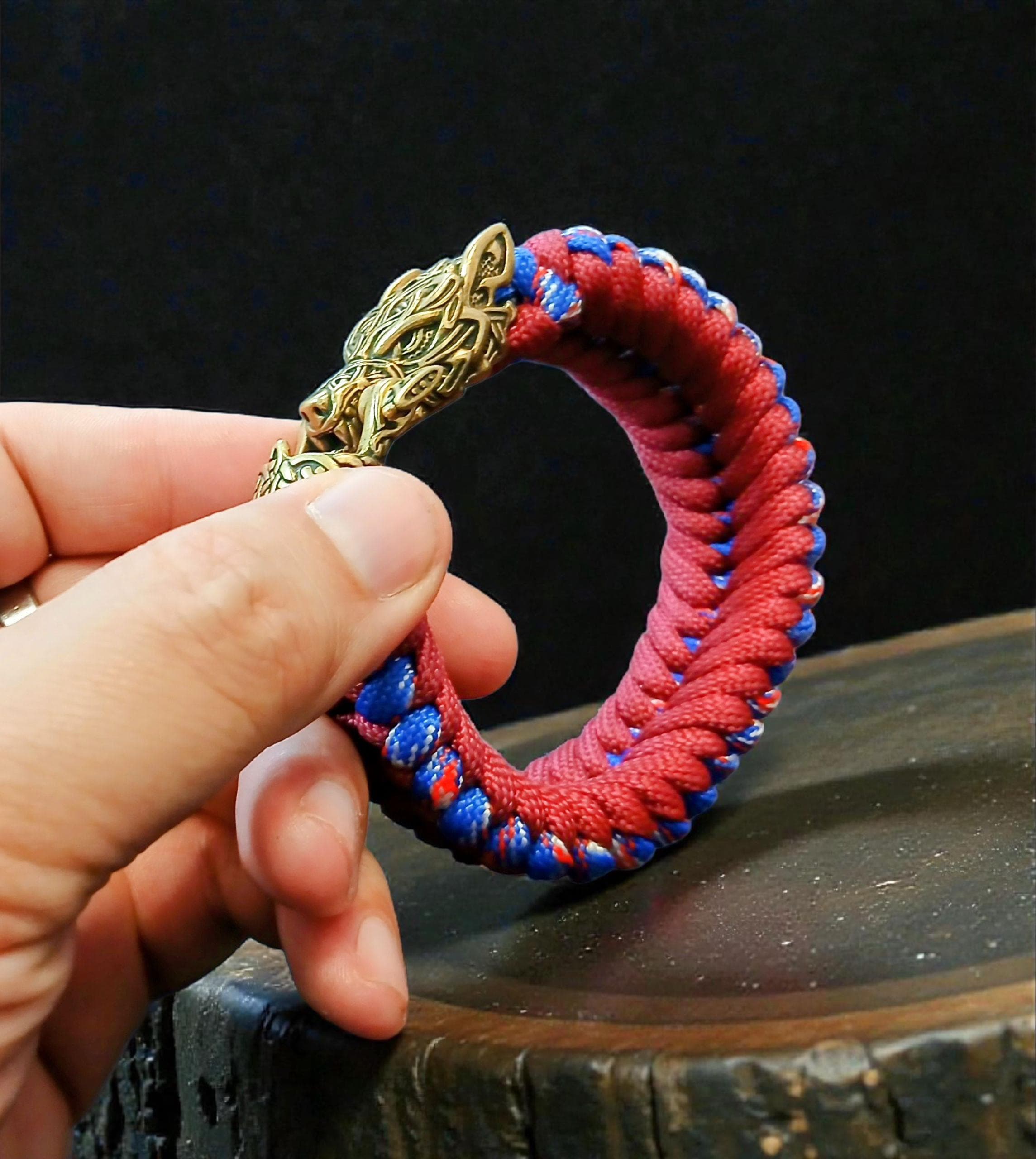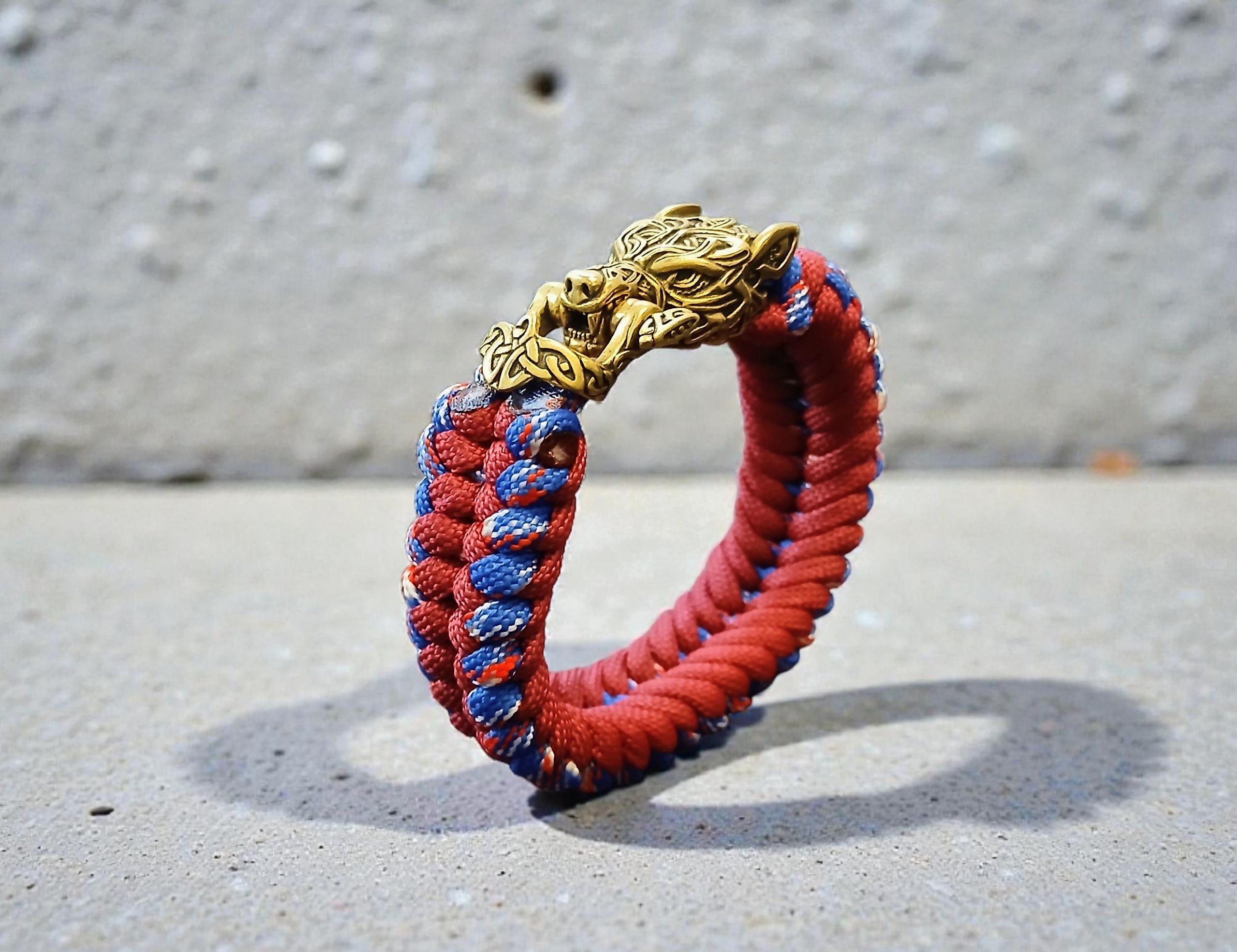 Hand-woven using high-strength 550 paracord, this bracelet blends deep red with electric blue, echoing shield patterns, war cloaks, and paint used by ancient warriors. The centrepiece is a detailed bronze wolf-head clasp, carved in knotwork style. The wolf symbolises courage, loyalty, and the unstoppable strength of the pack.