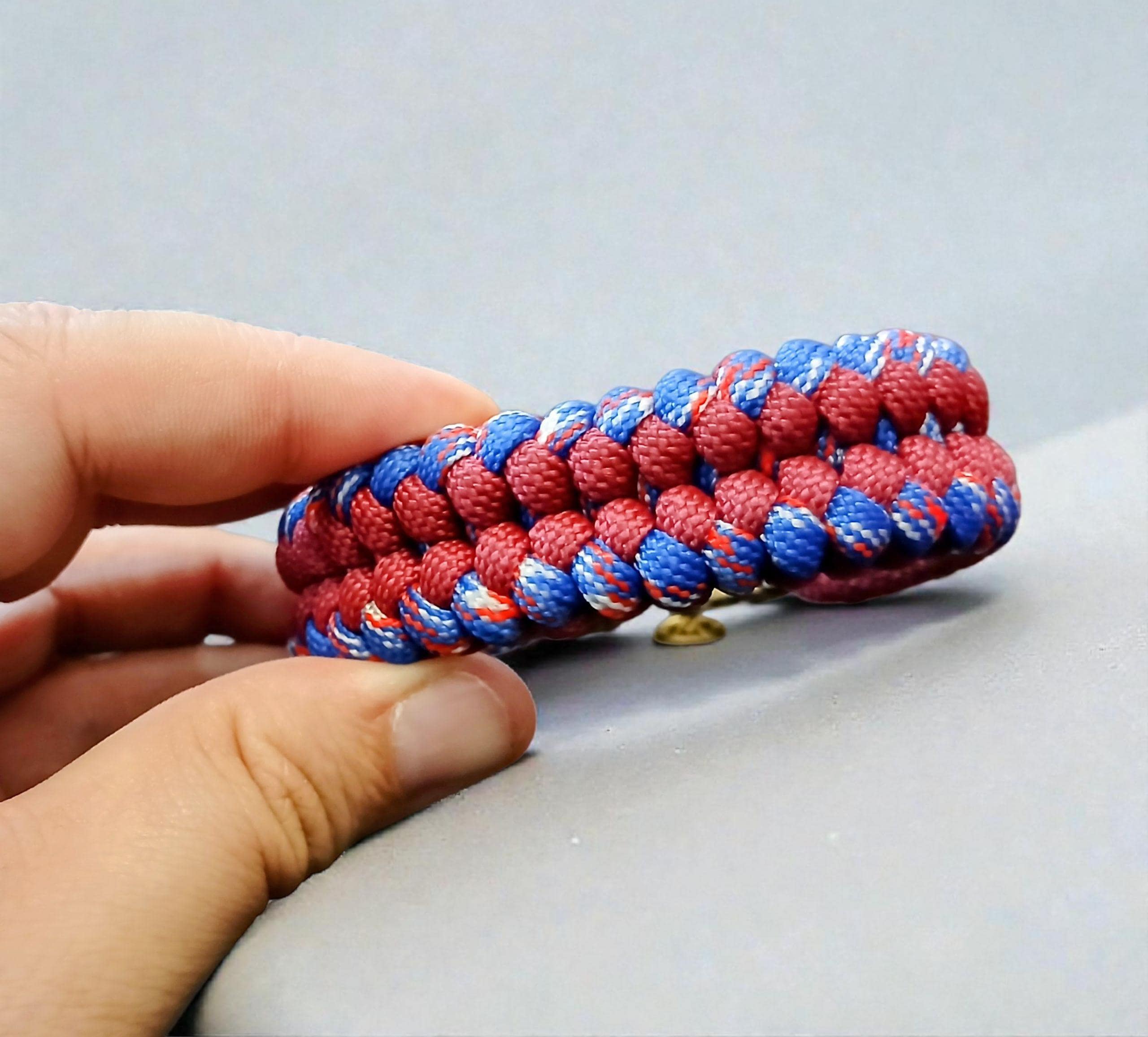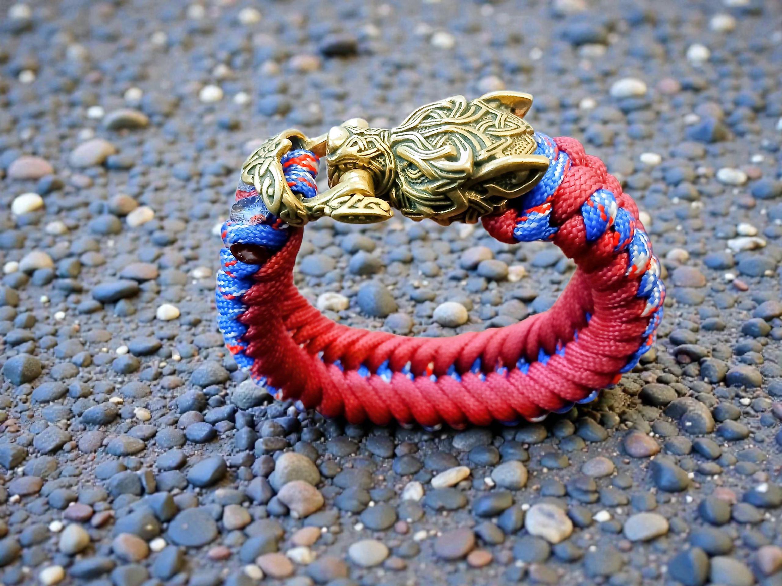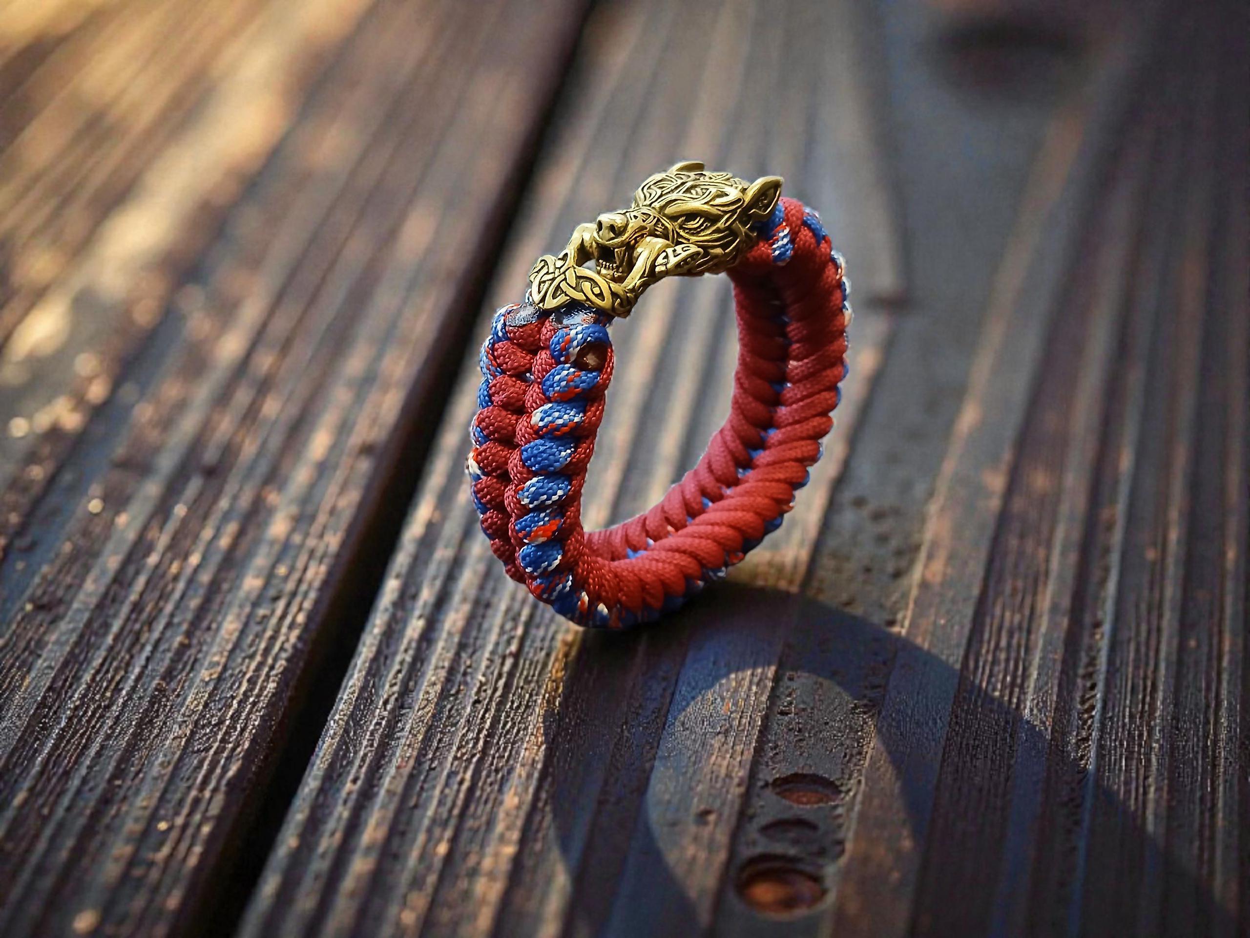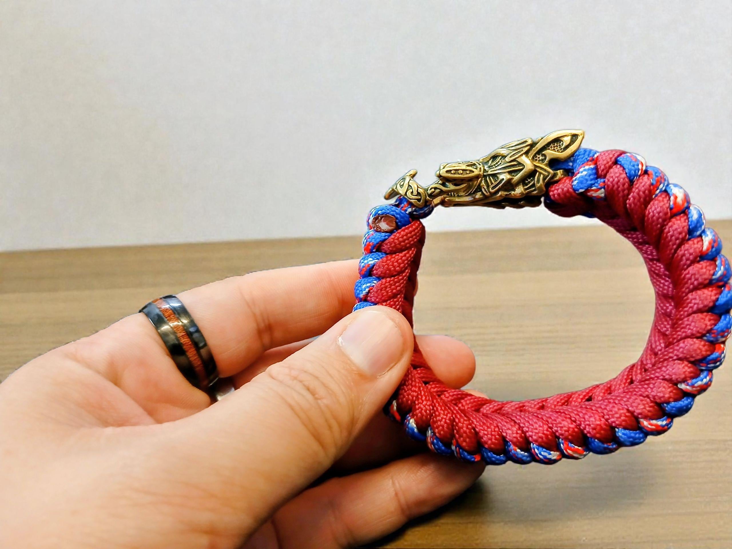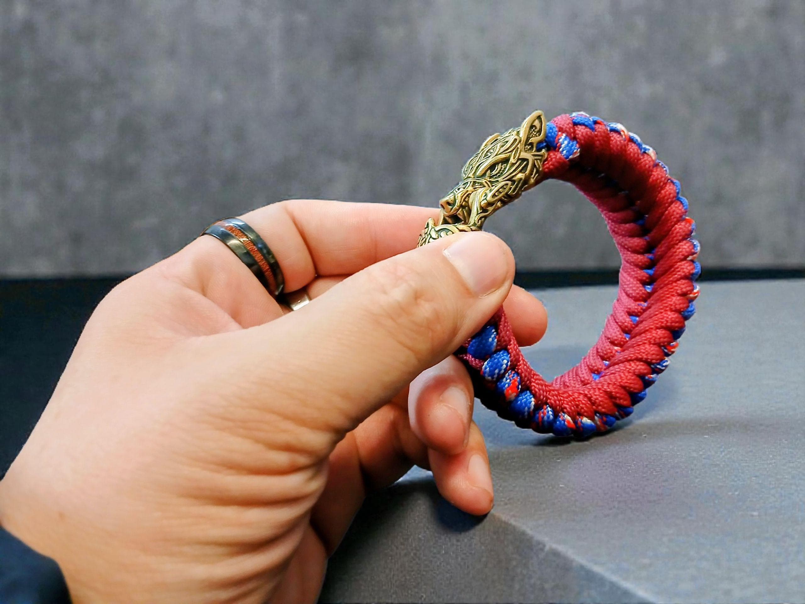 Hand-woven using high-strength 550 paracord, this bracelet blends deep red with electric blue, echoing shield patterns, war cloaks, and paint used by ancient warriors. The centrepiece is a detailed bronze wolf-head clasp, carved in knotwork style. The wolf symbolises courage, loyalty, and the unstoppable strength of the pack.